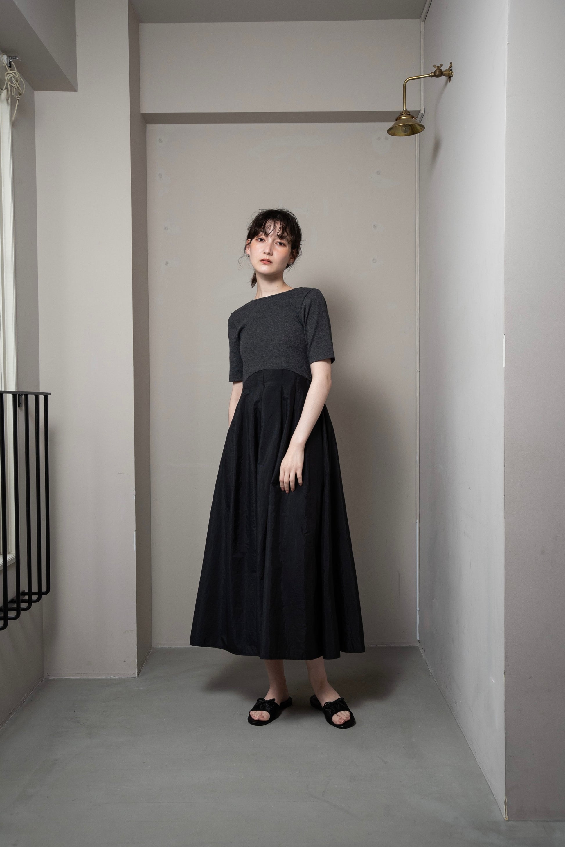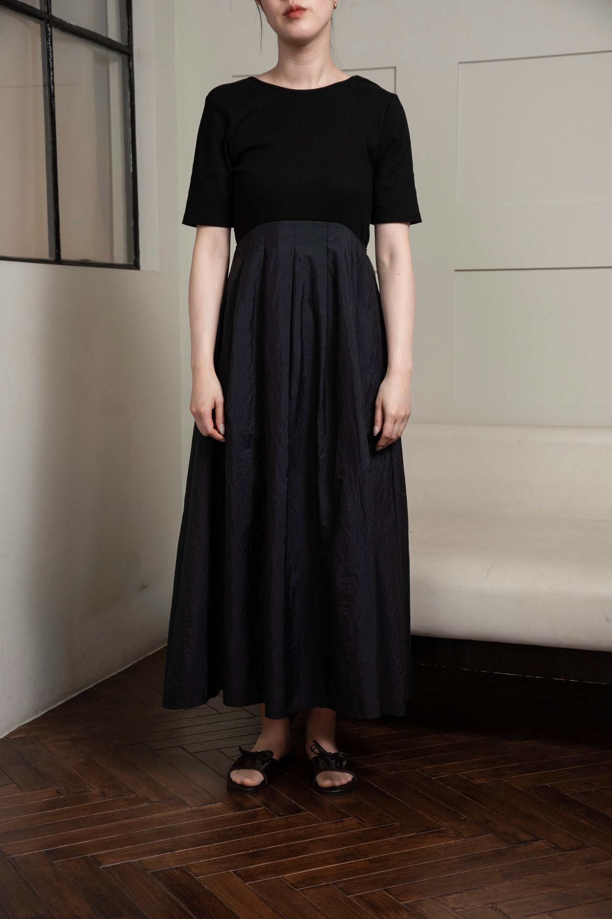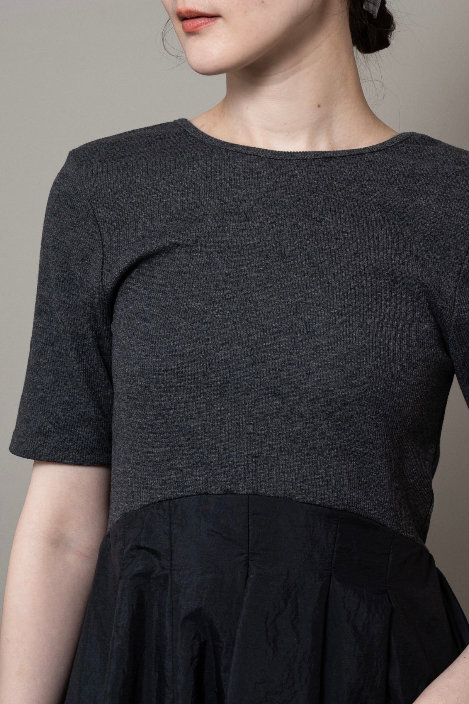 ・トップス部分とスカート部分の素材の切り替えがアクセントのワンピース