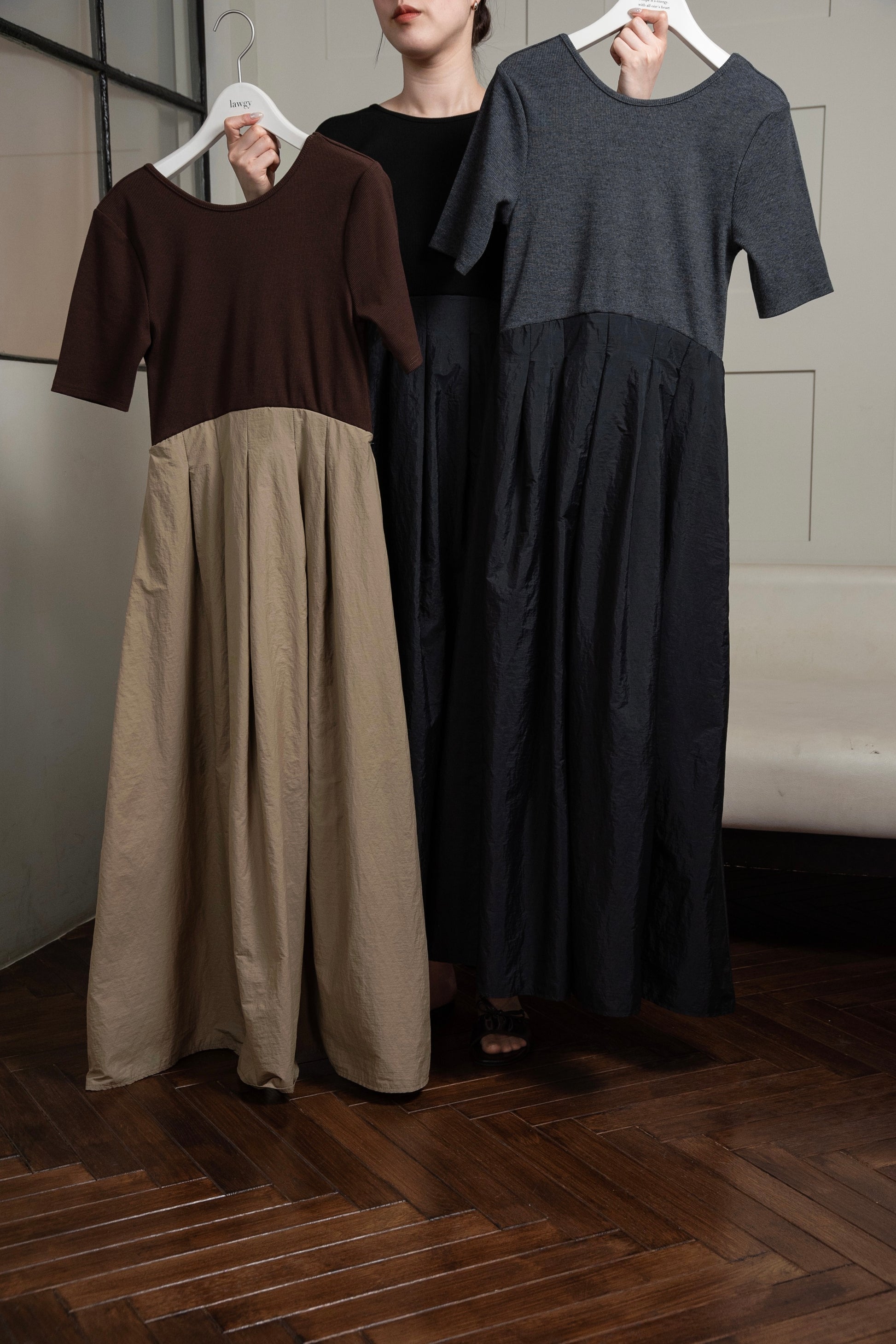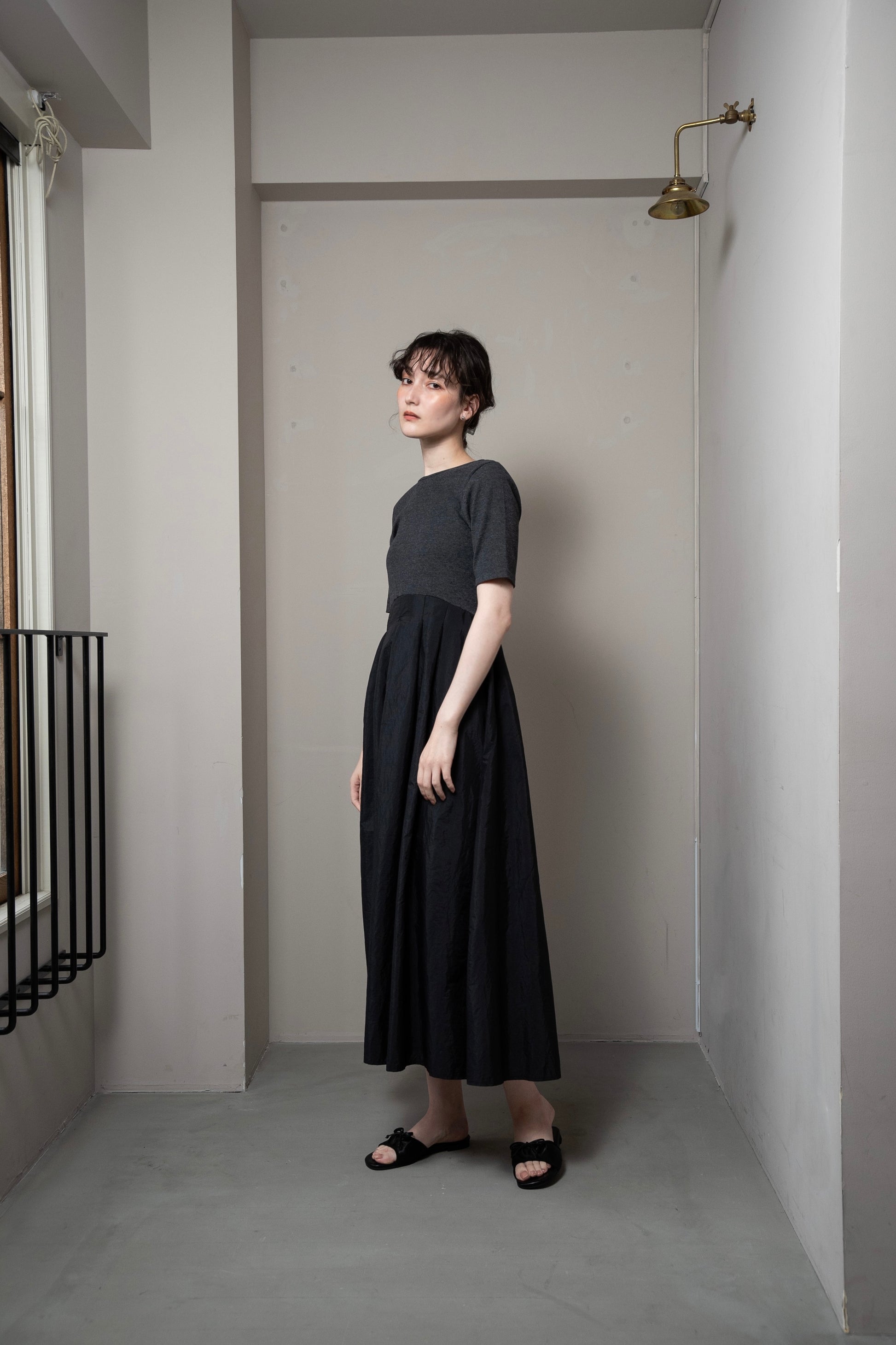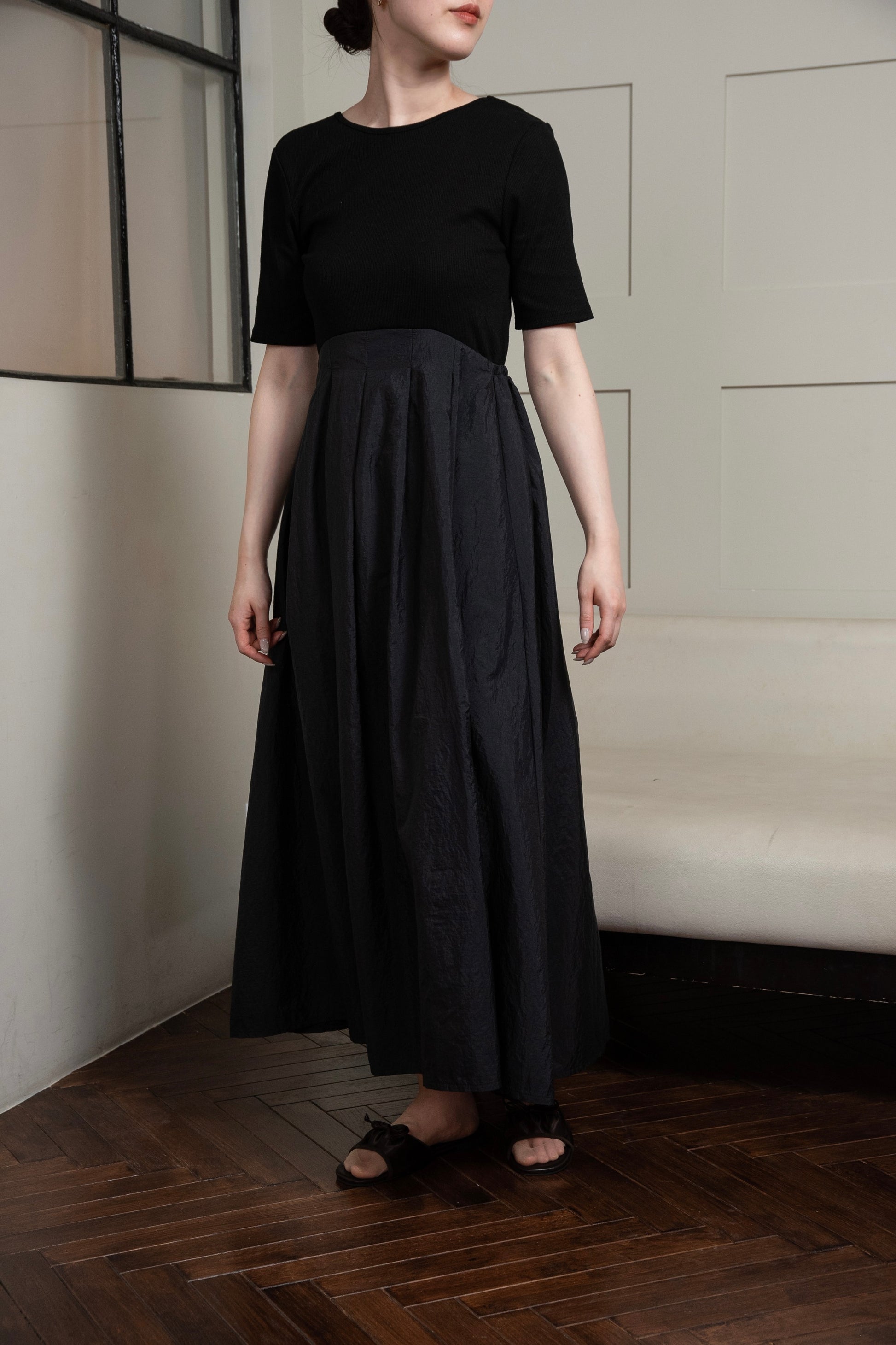 ・トップス部分とスカート部分の素材の切り替えがアクセントのワンピース