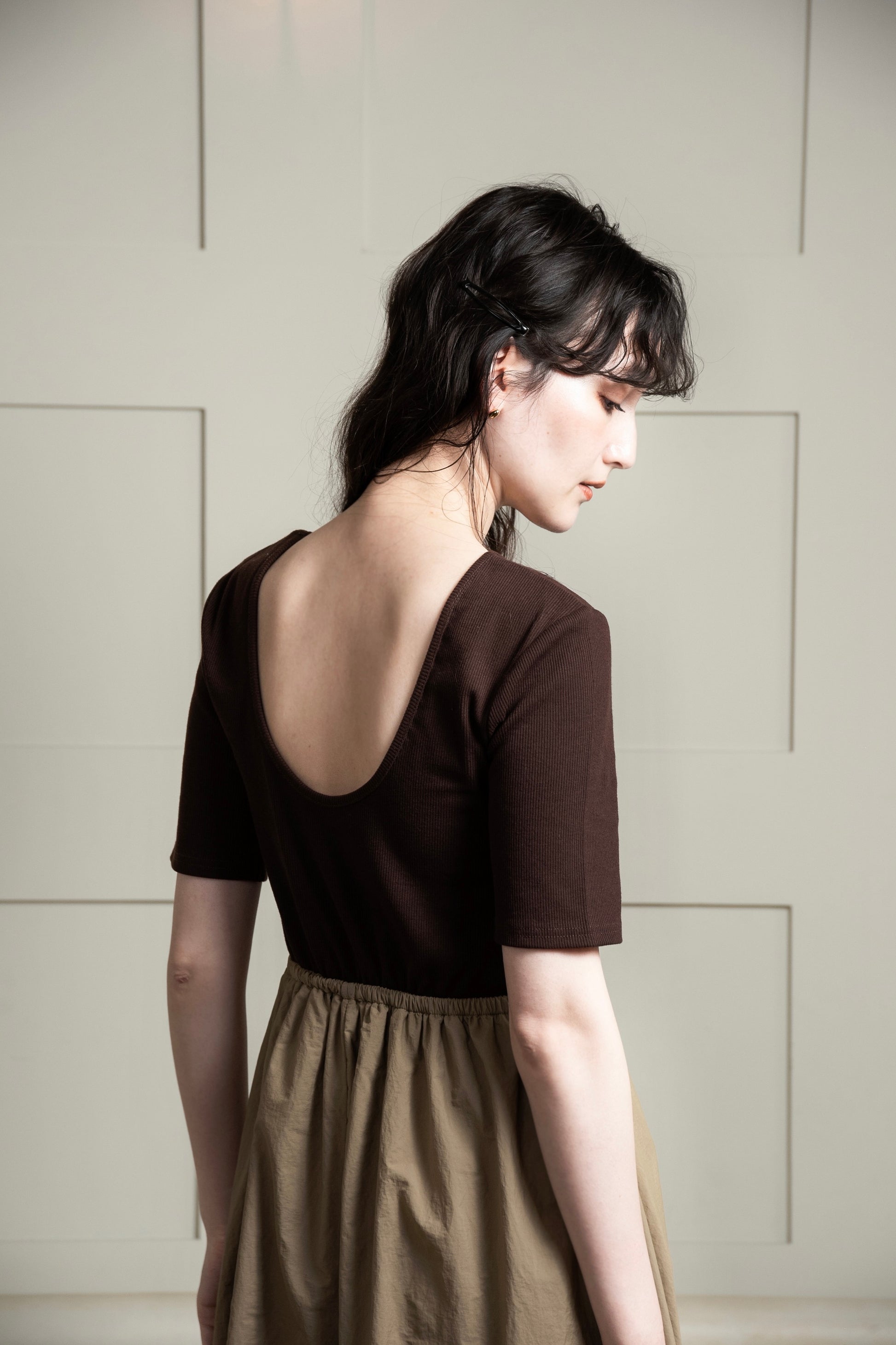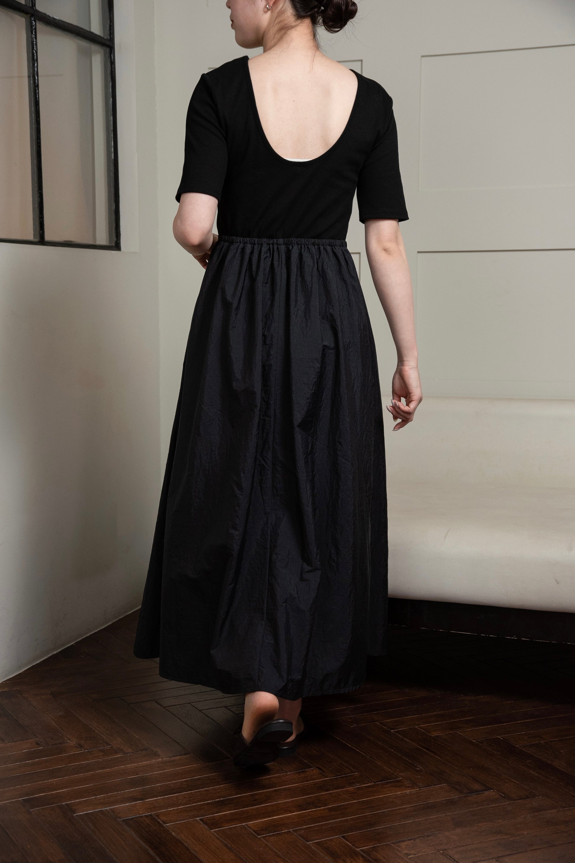 ・程よいバックオープン仕様でさりげない肌見せが叶う一着