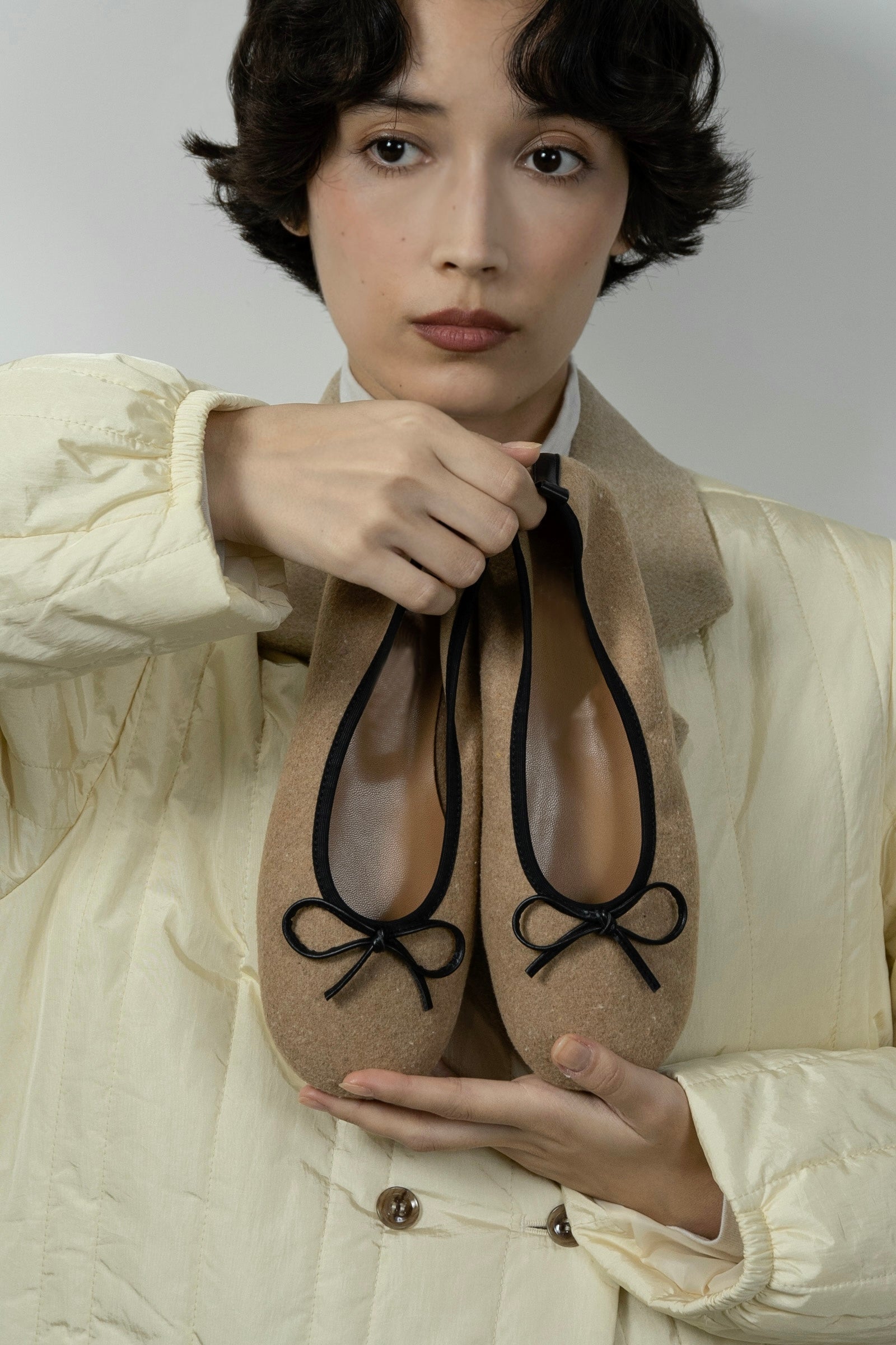 ・暖かみのある素材感と、上品なリボンが目を引くパンプス