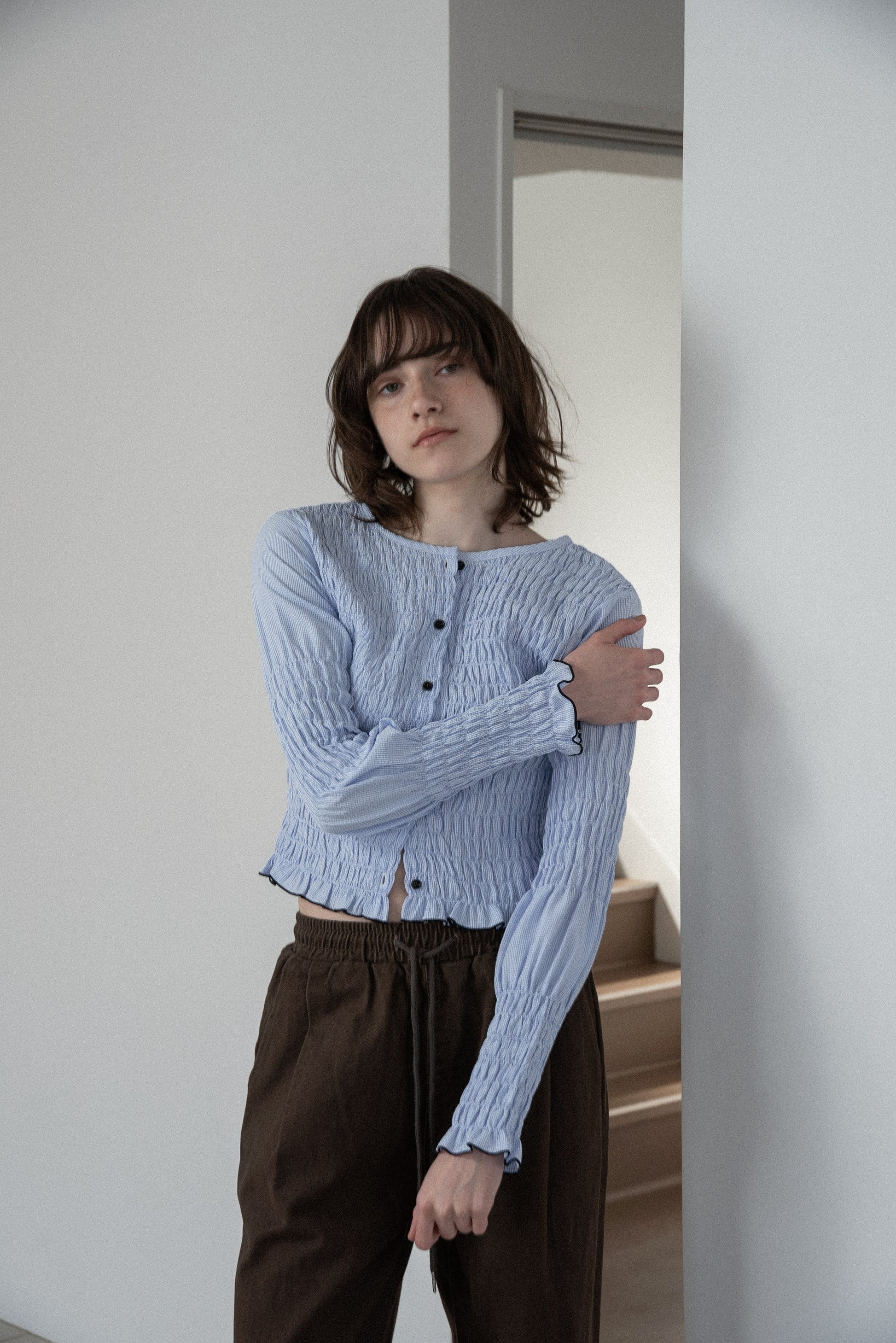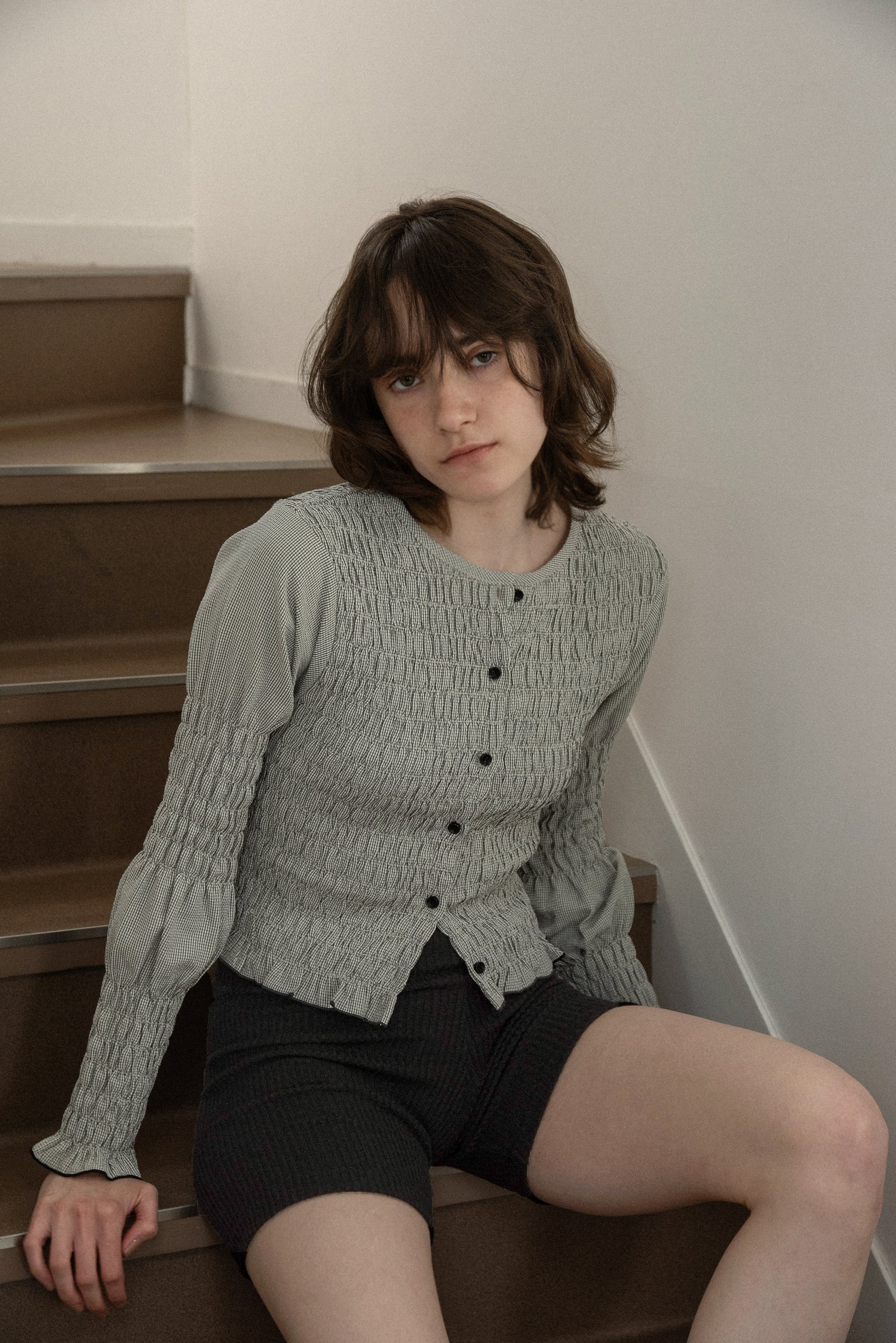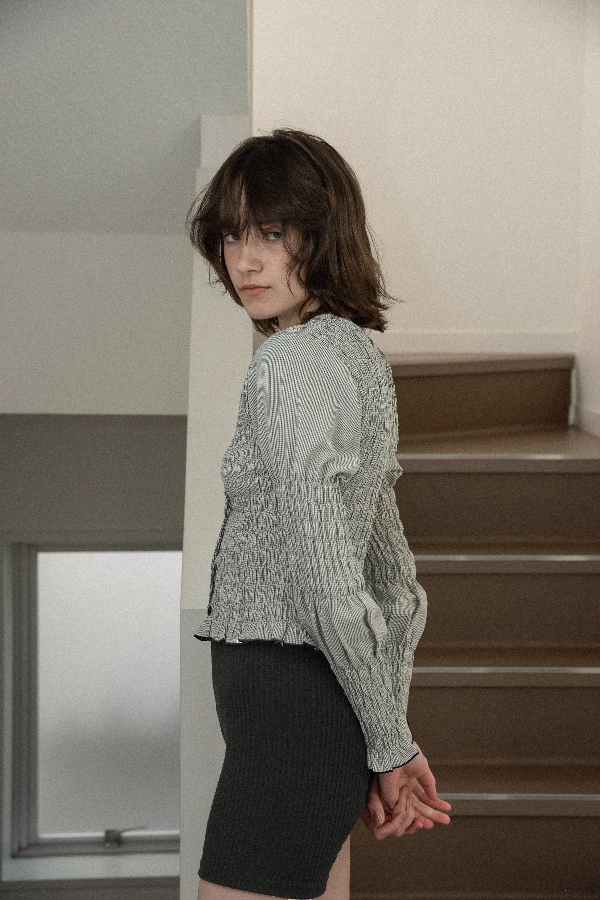 ・全体に施されたシャーリングデザインが目を惹くブラウス