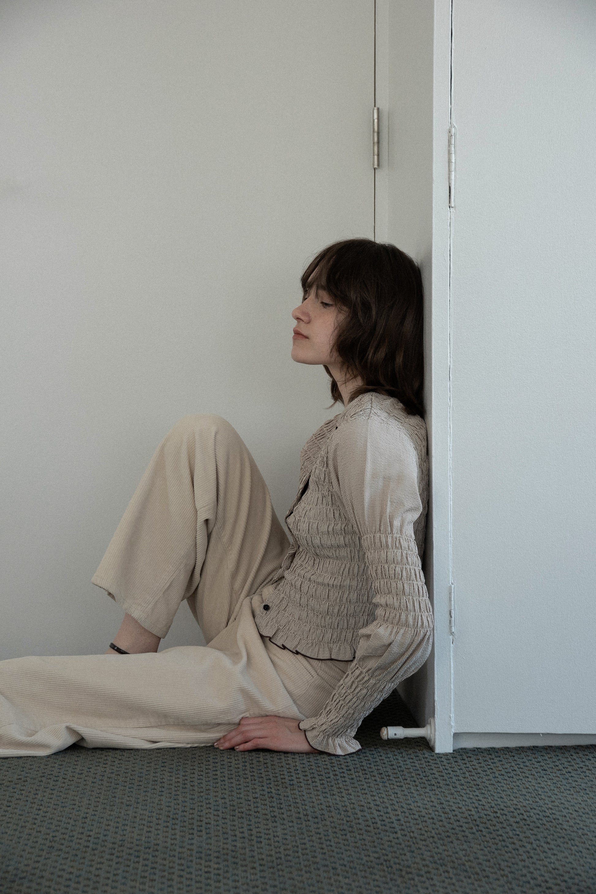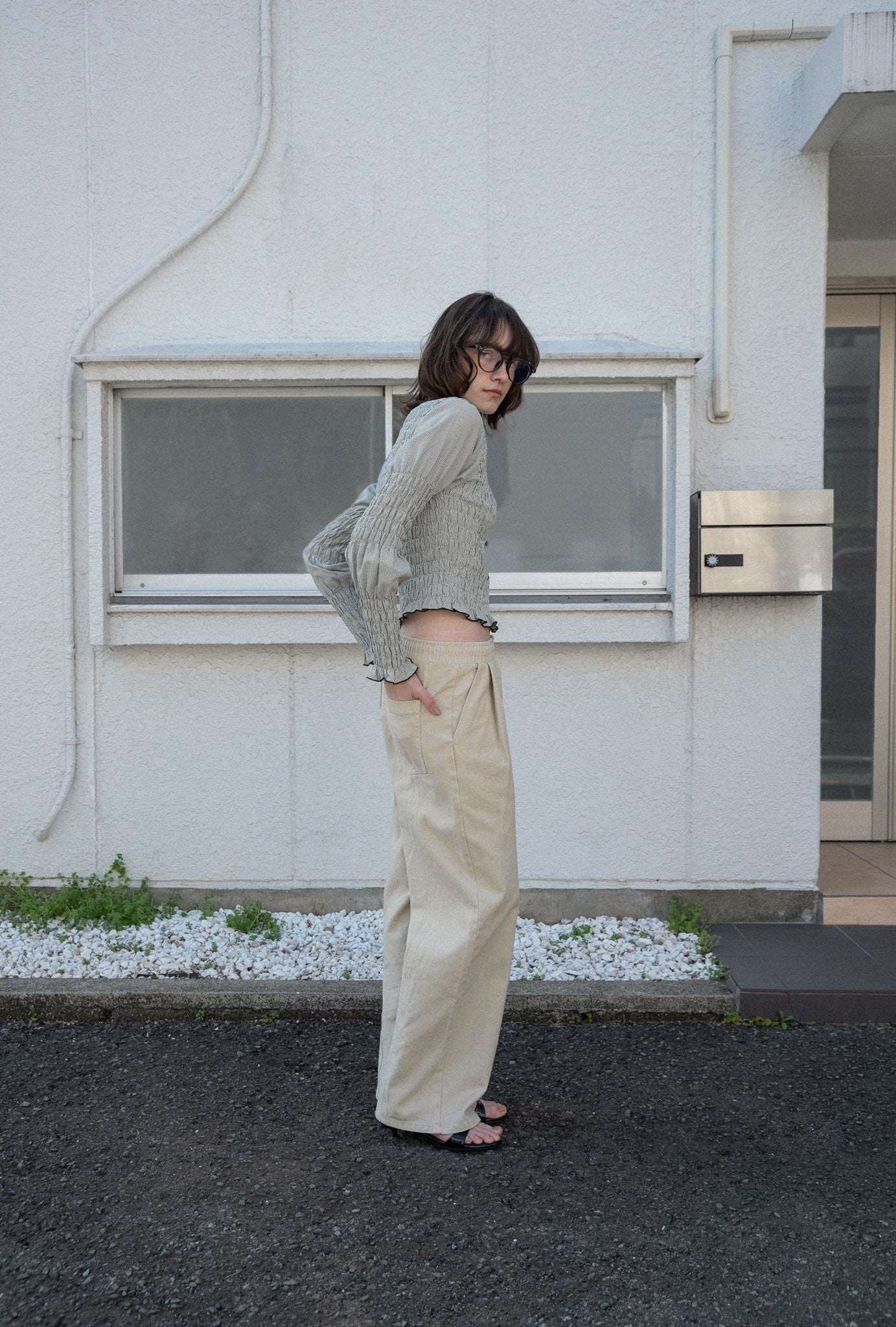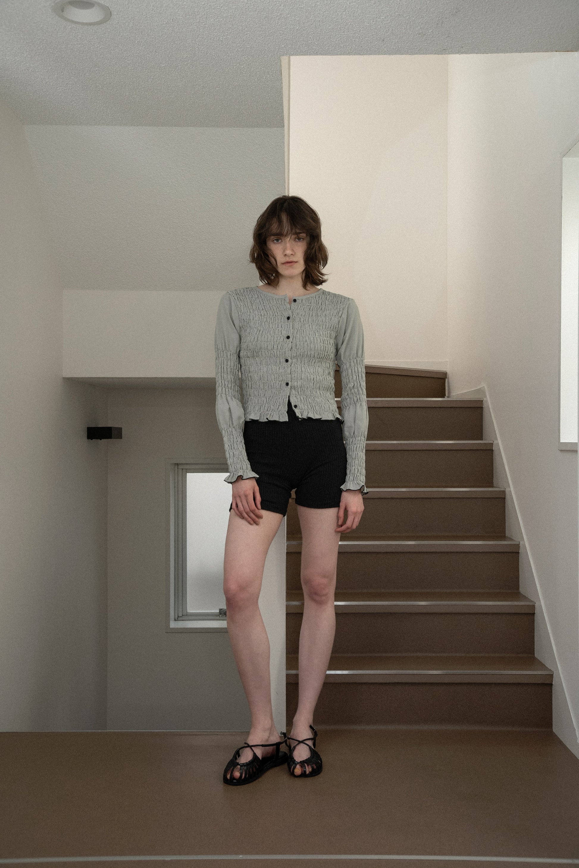 ・全体に施されたシャーリングデザインが目を惹くブラウス