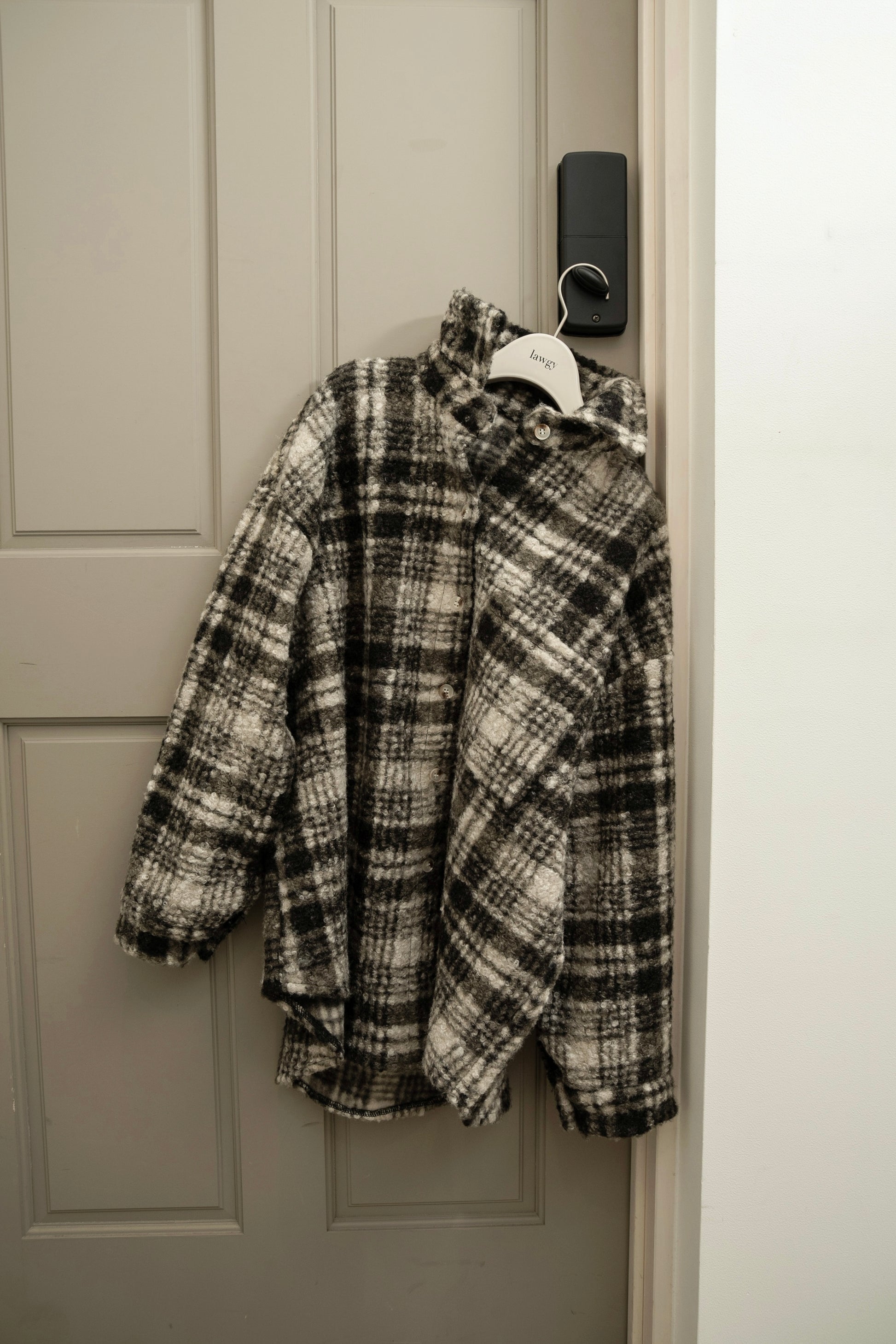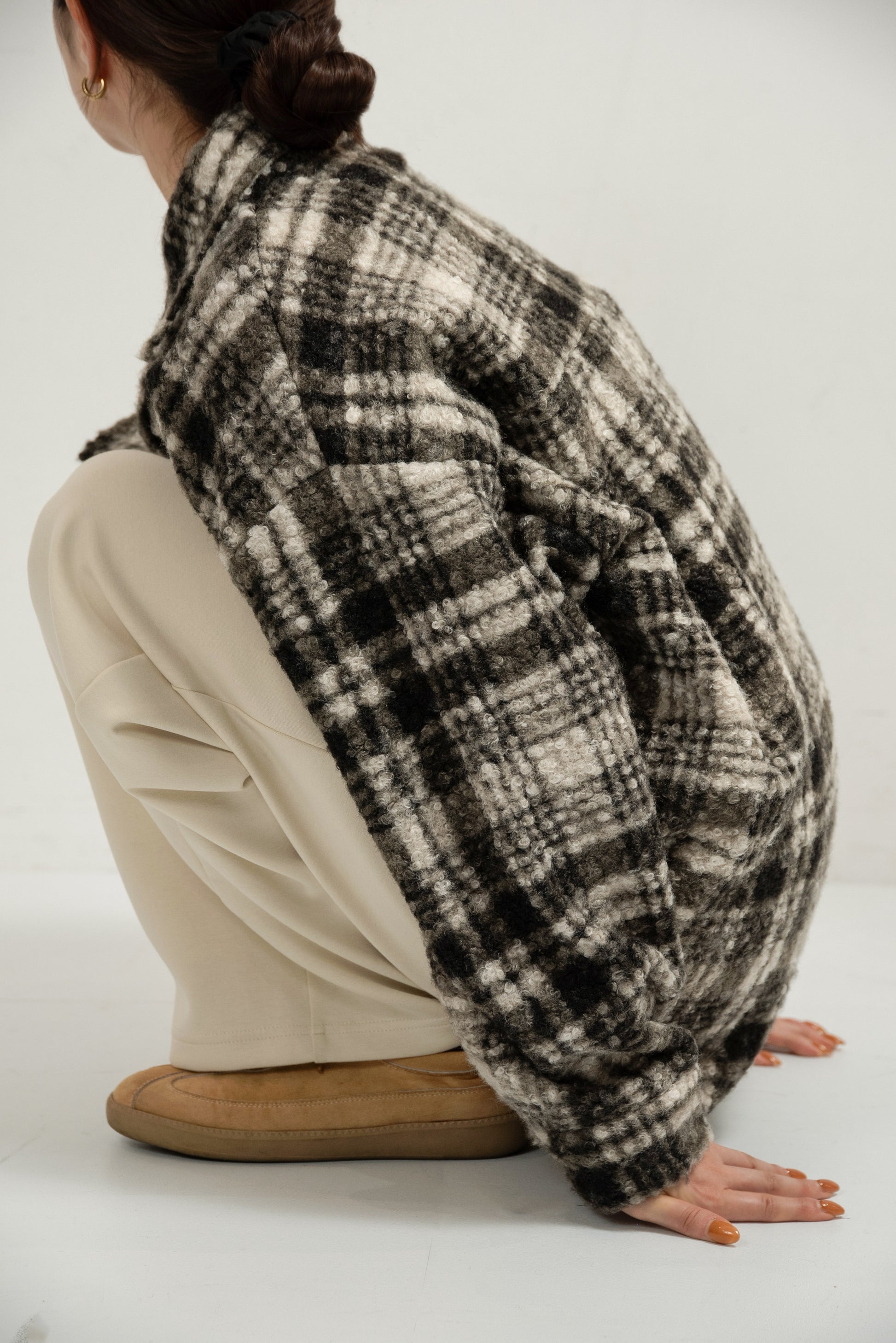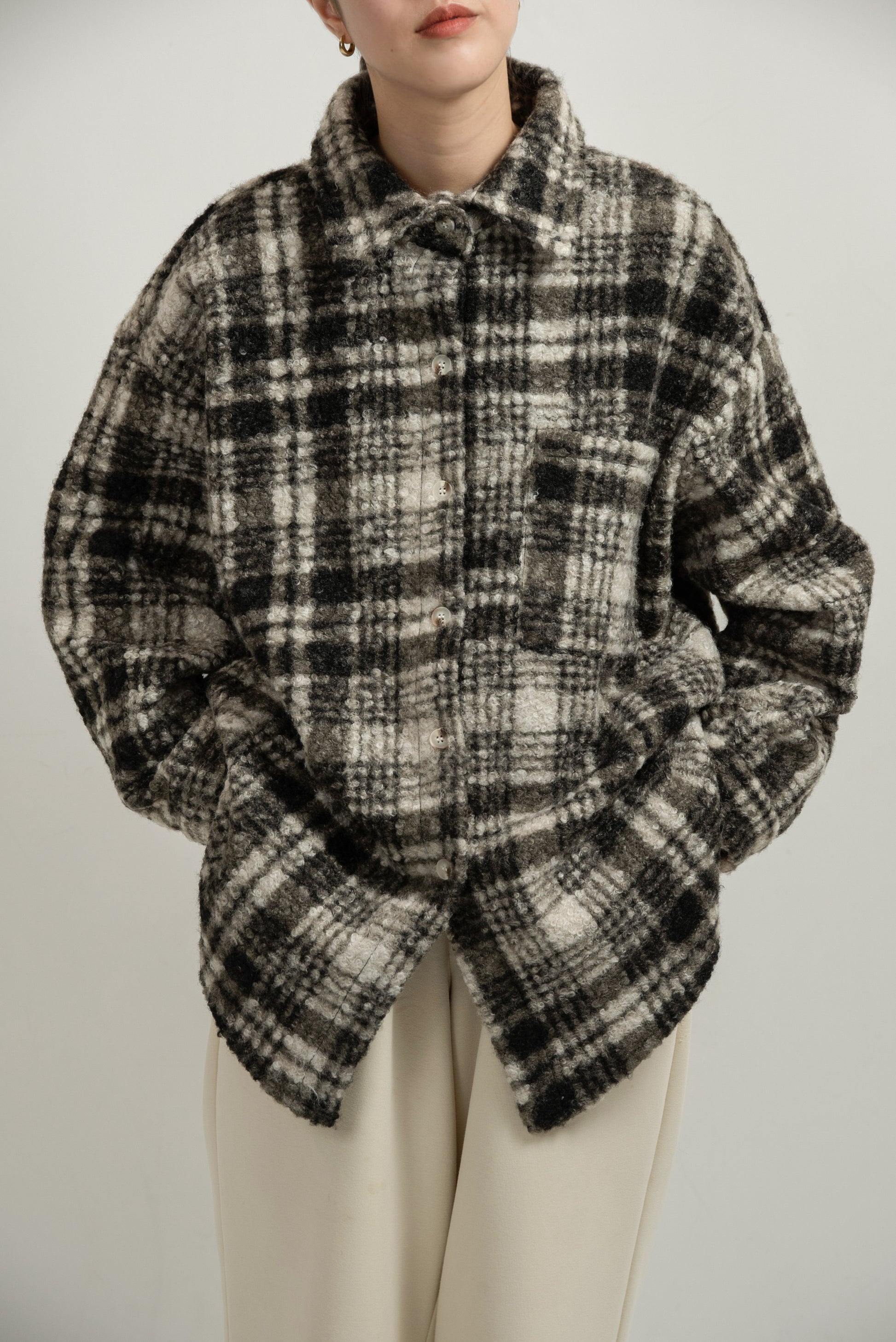 ・くるくると巻かれたような毛並みが可愛い、ボア素材のチェックシャツアウター