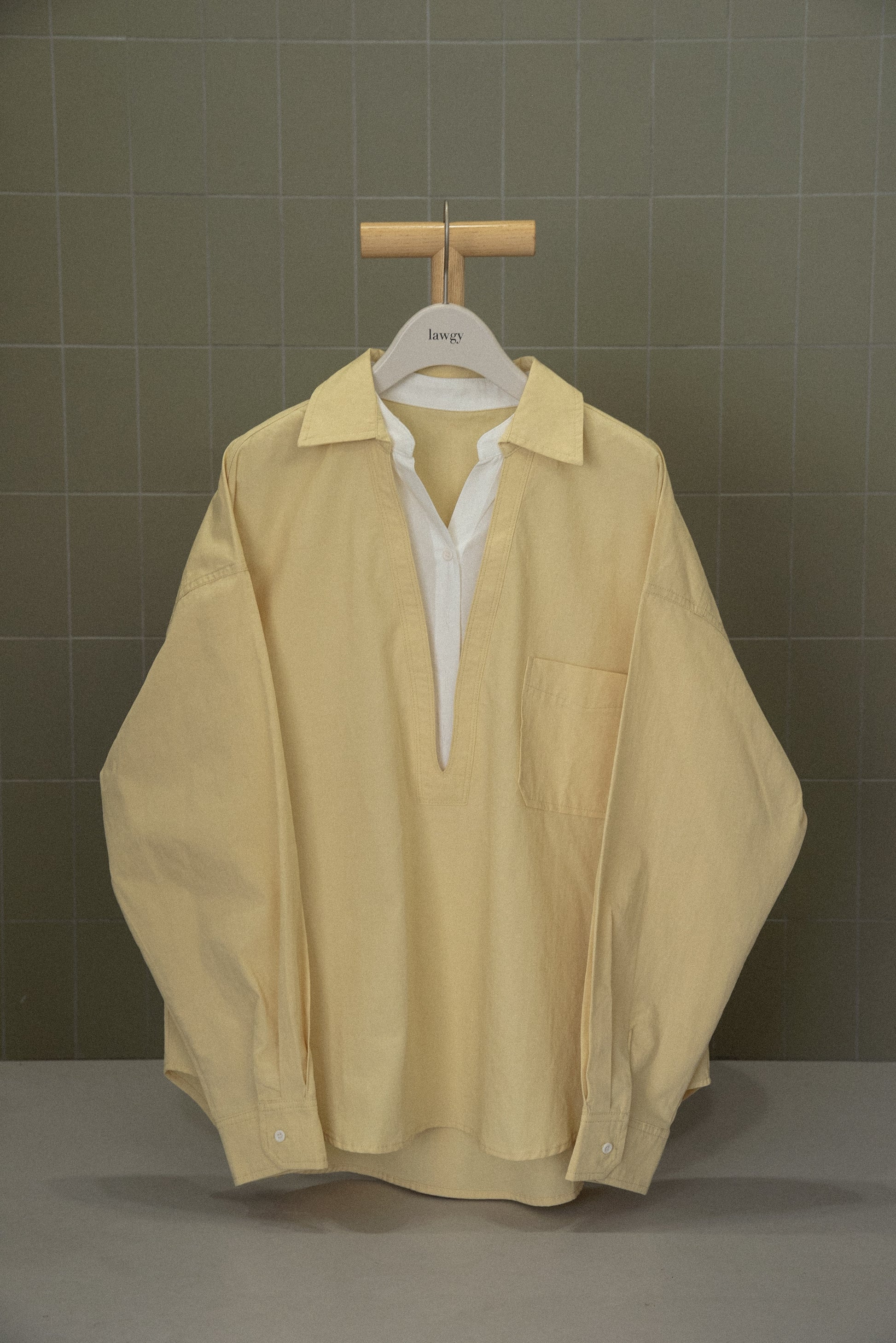 ・スタンドカラーにシャツを重ねたような、襟元のレイヤードデザインが印象的なVネックシャツ