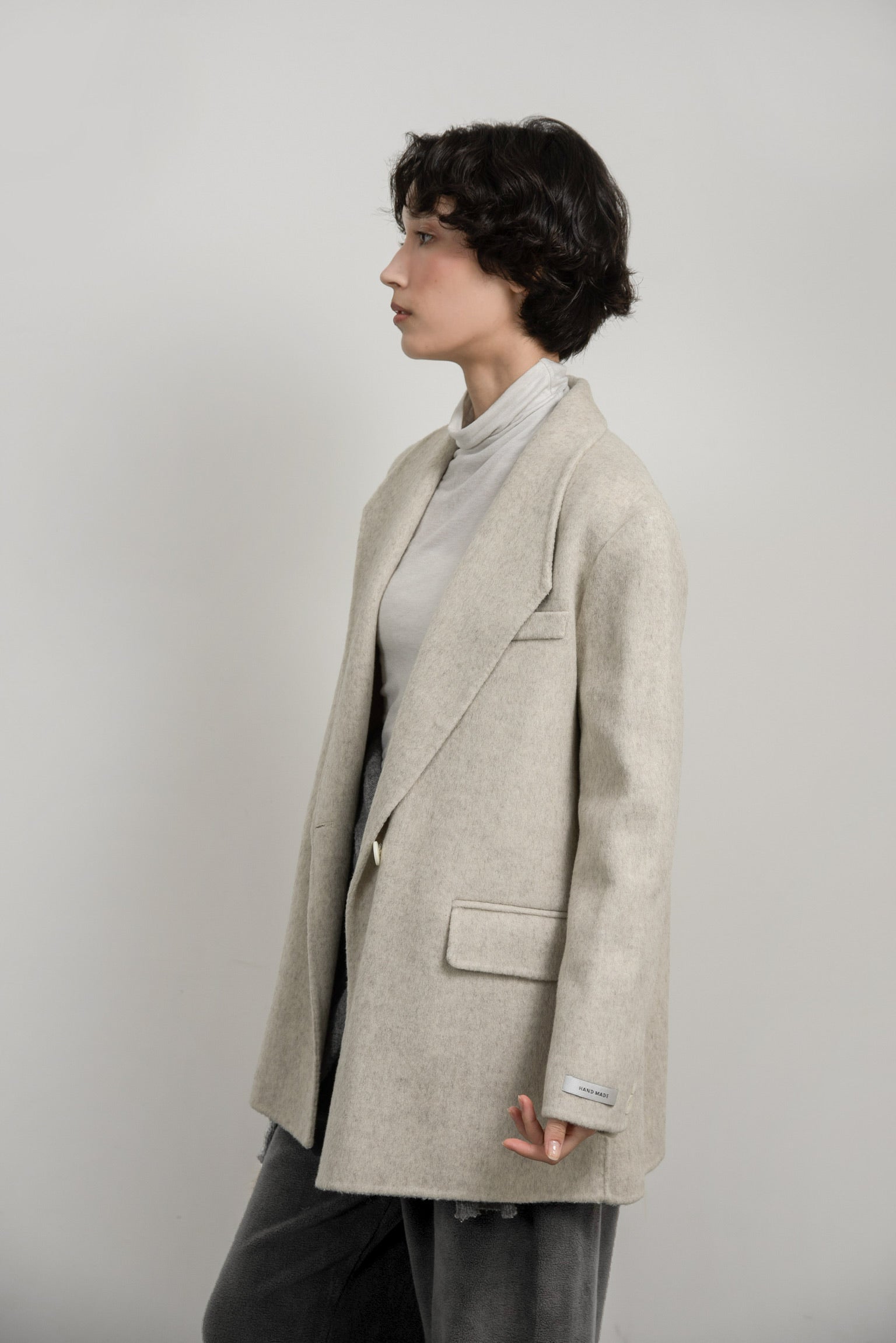 ・台形のような大きめの襟が目を引く、こだわりのハンドメイドジャケットコート。