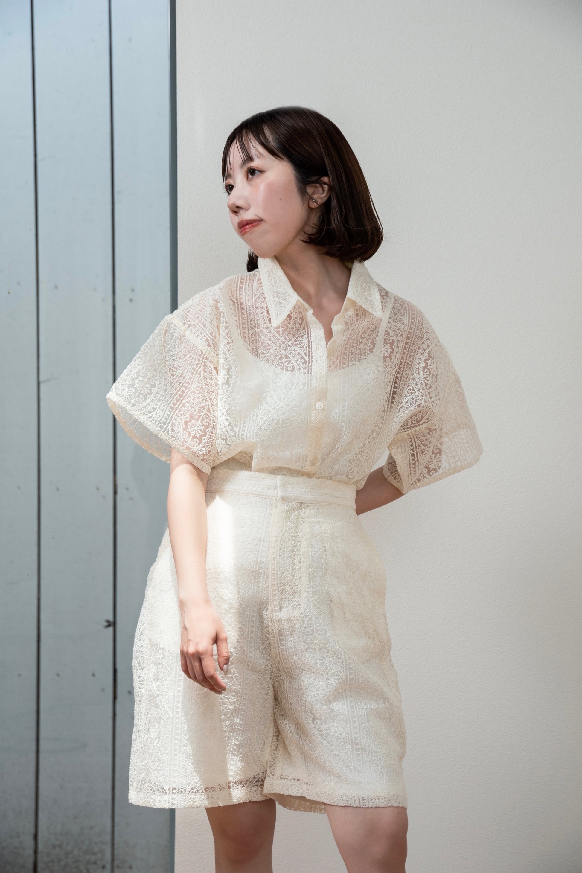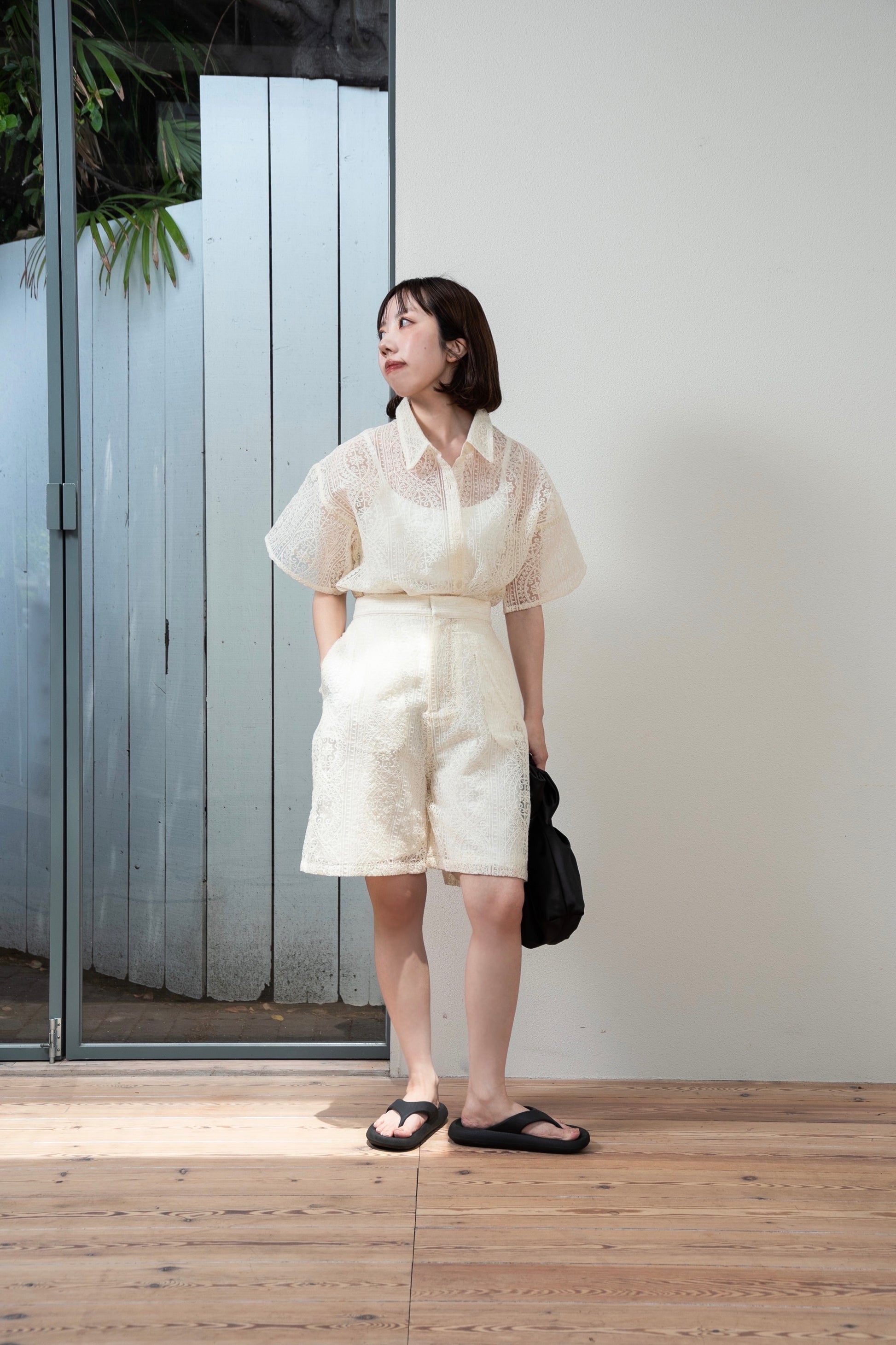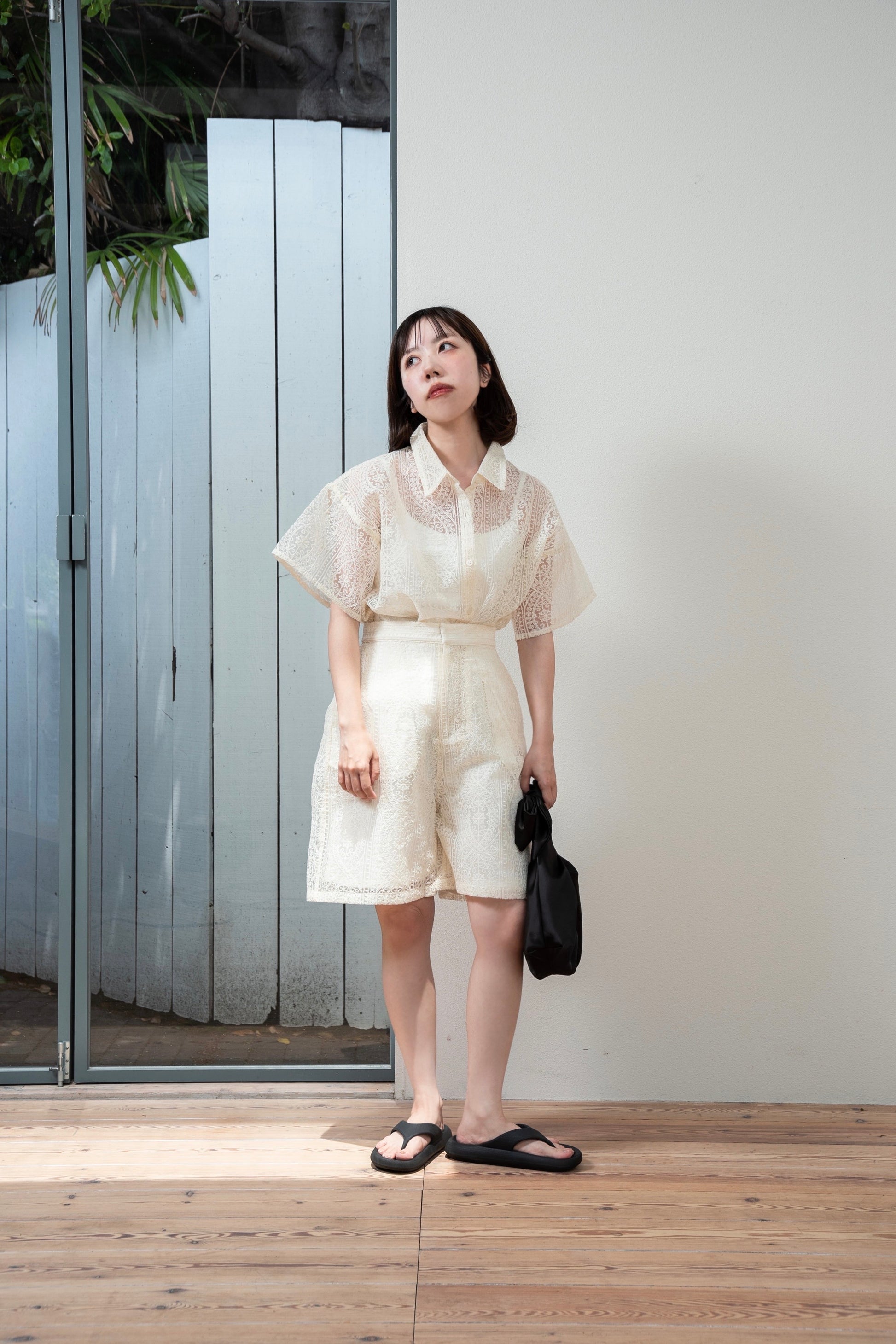 ・シアー生地とレースの組み合わせが目を引くショートパンツ