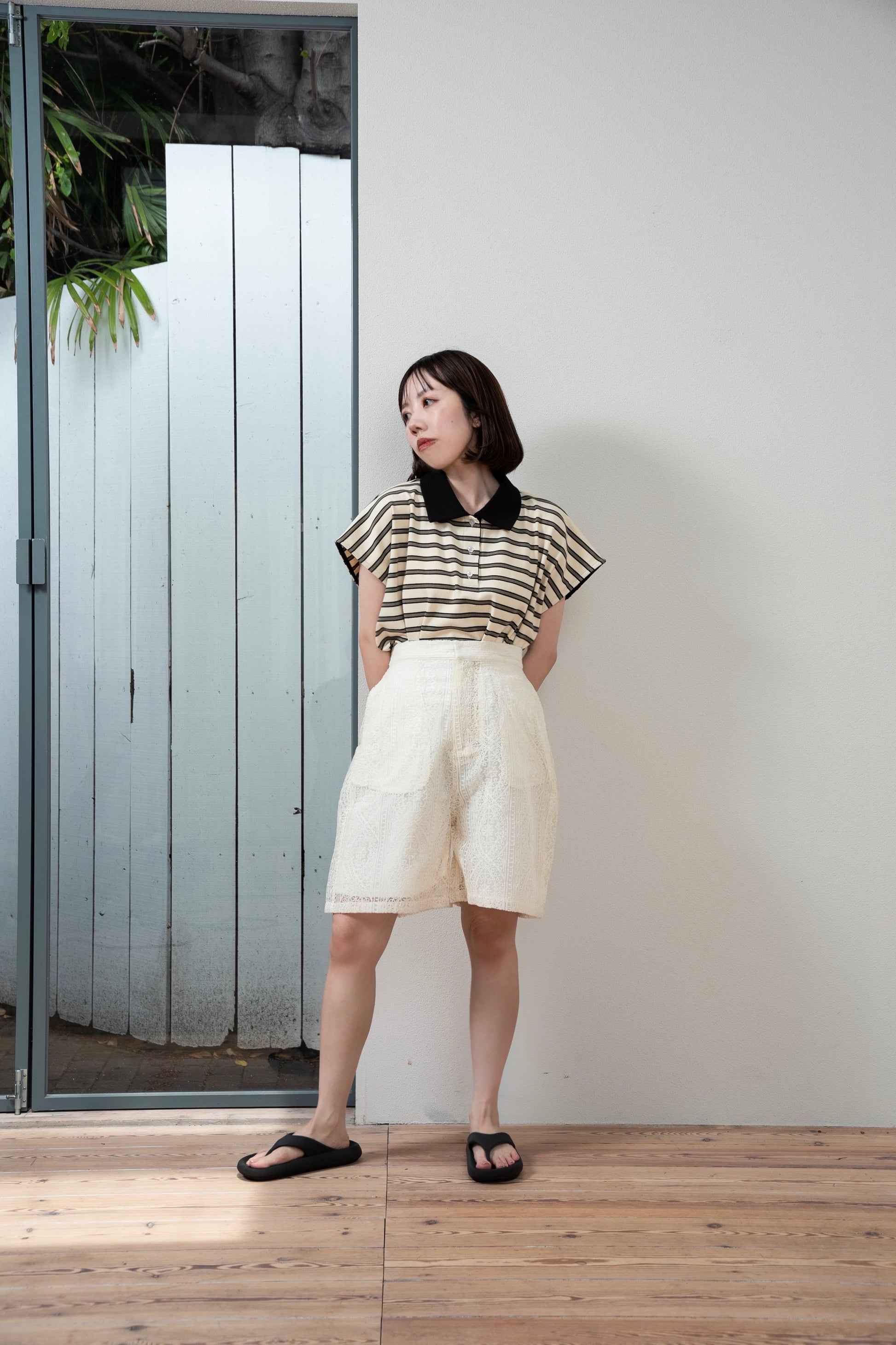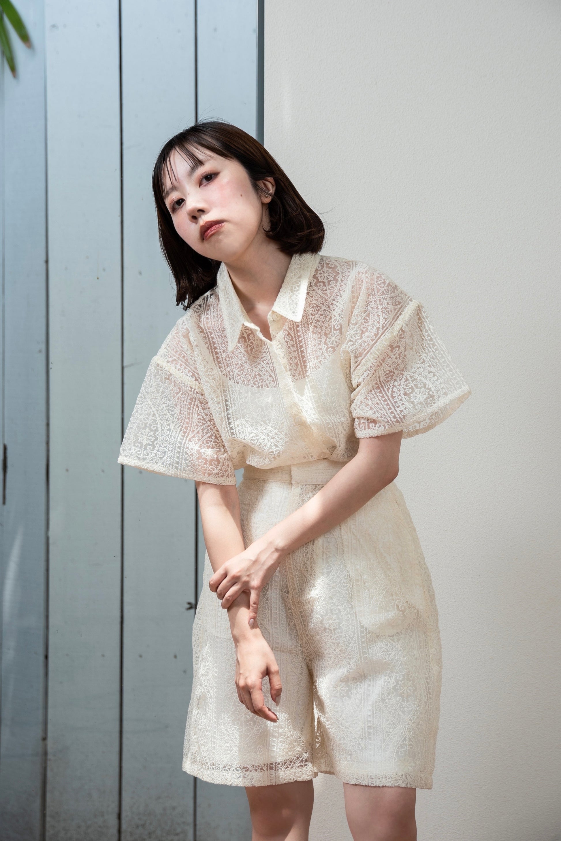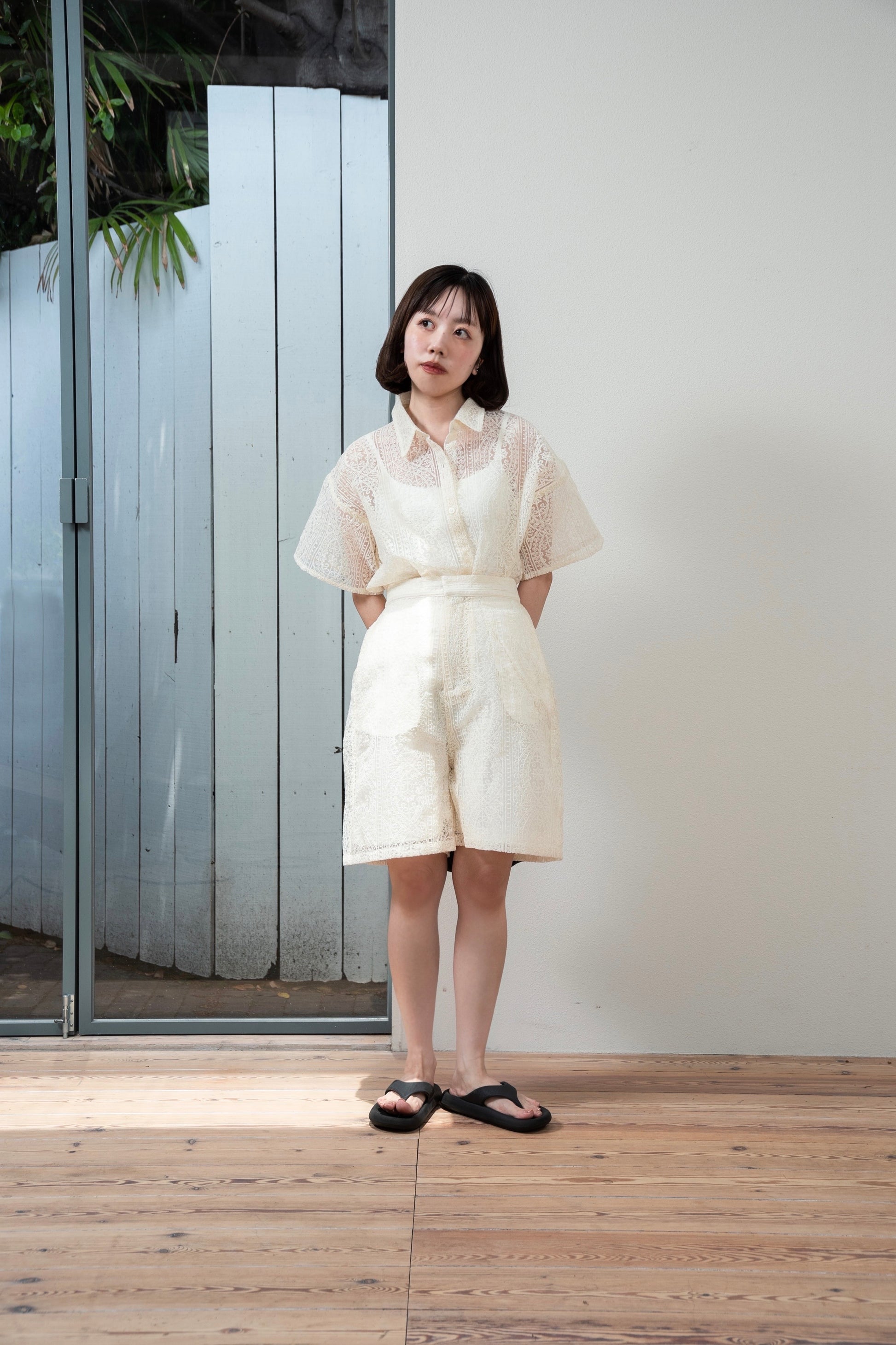 ・シアー生地とレースの組み合わせが目を引くショートパンツ