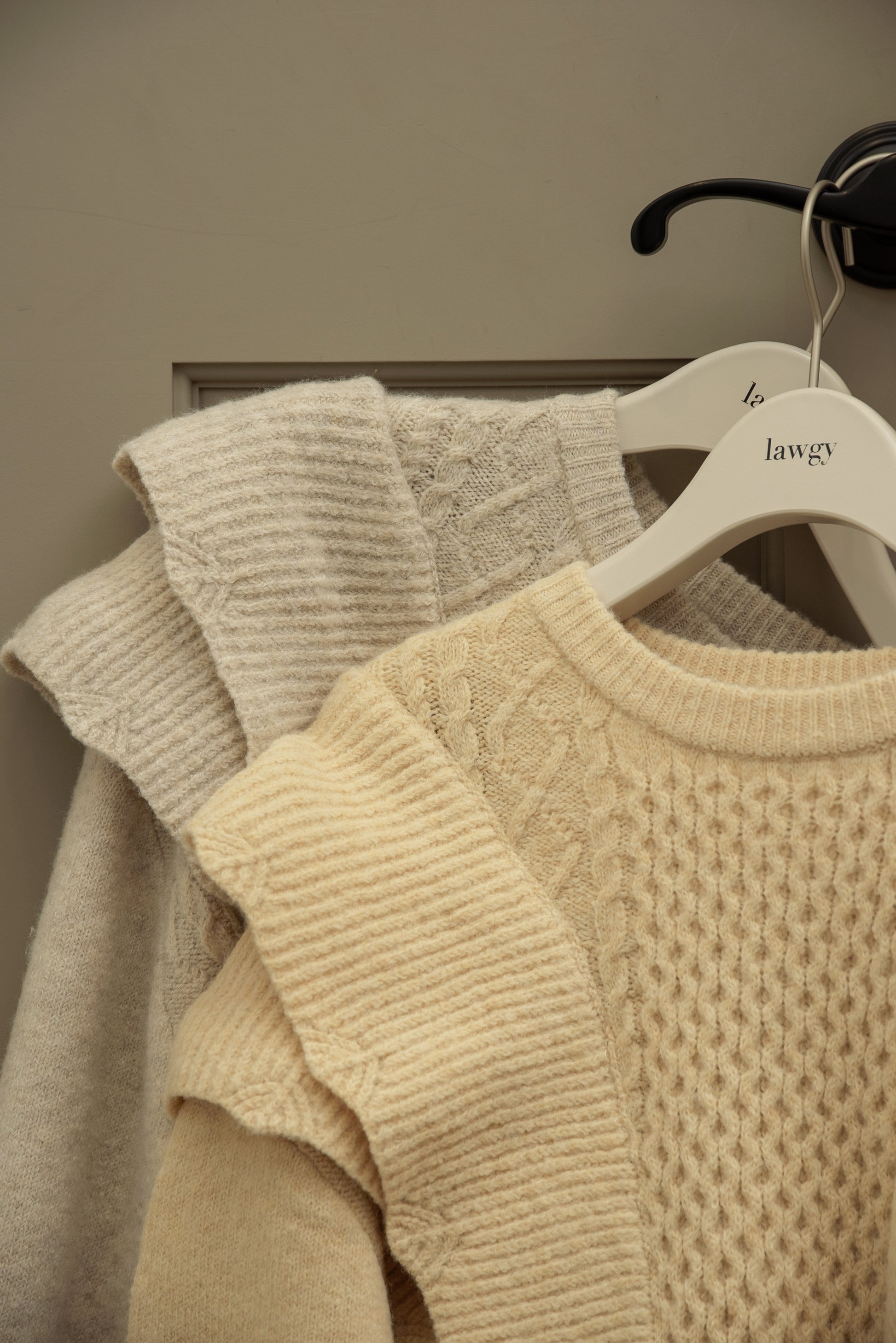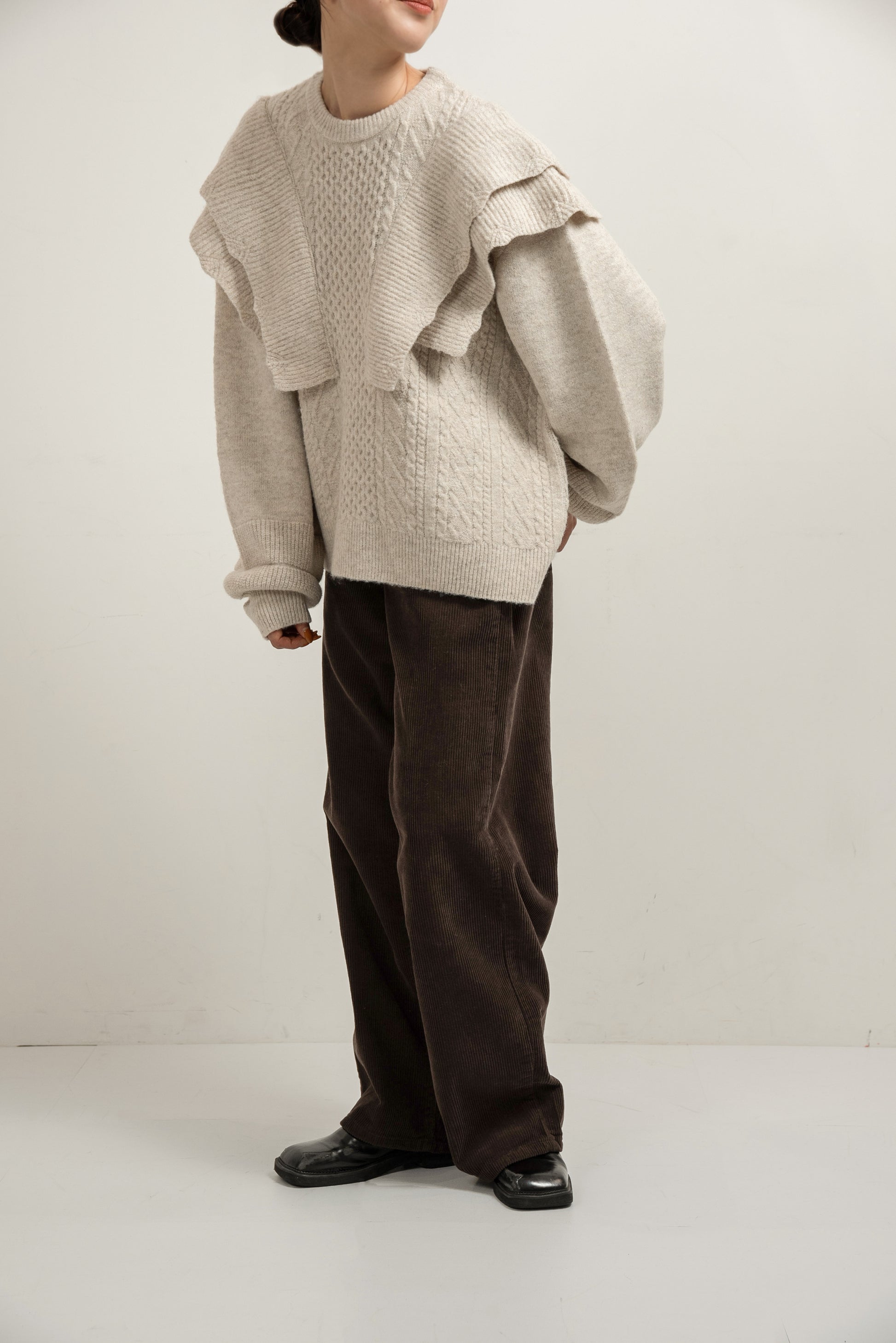 ・身頃はケーブル柄、袖はフラット編みでメリハリのあるデザインに