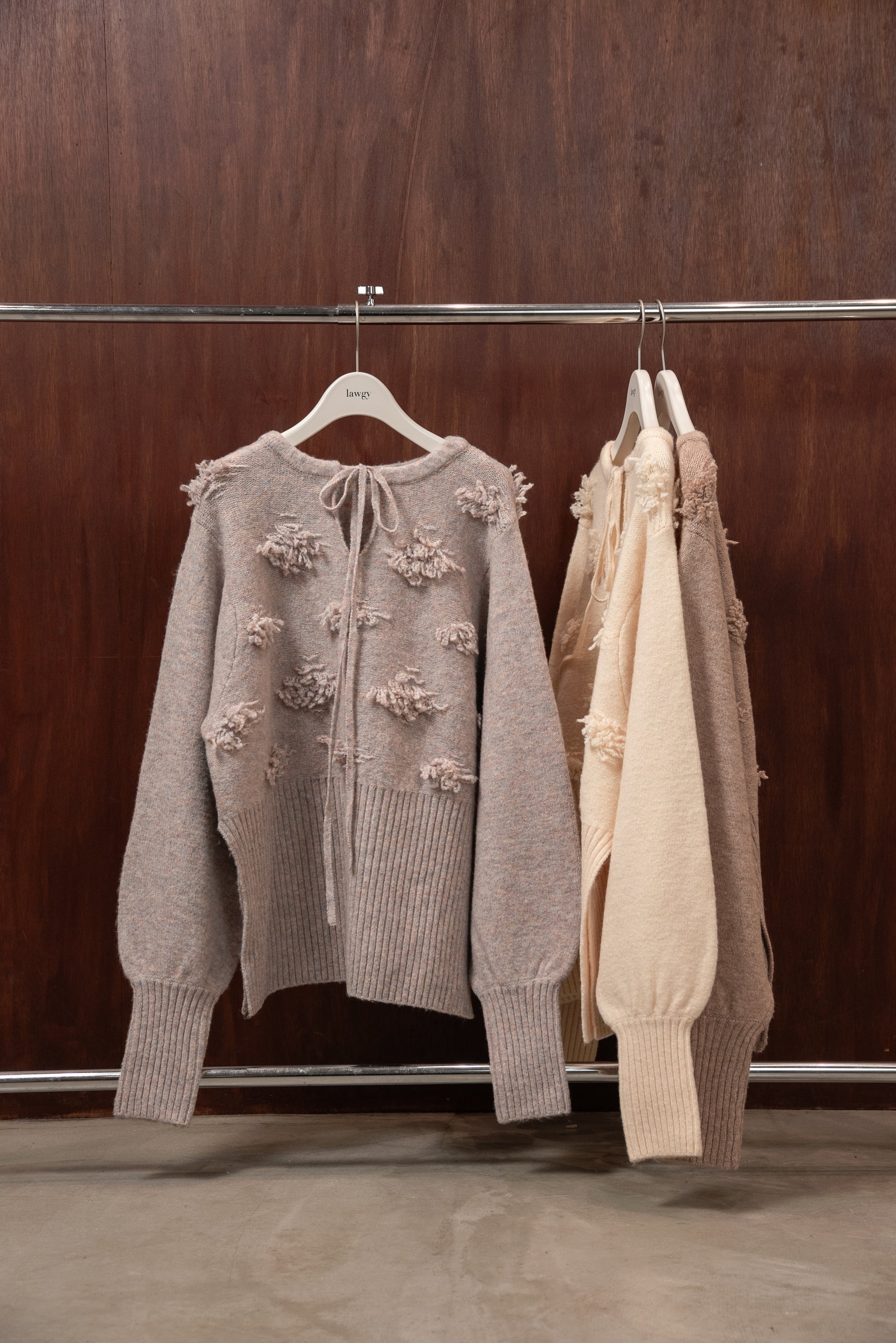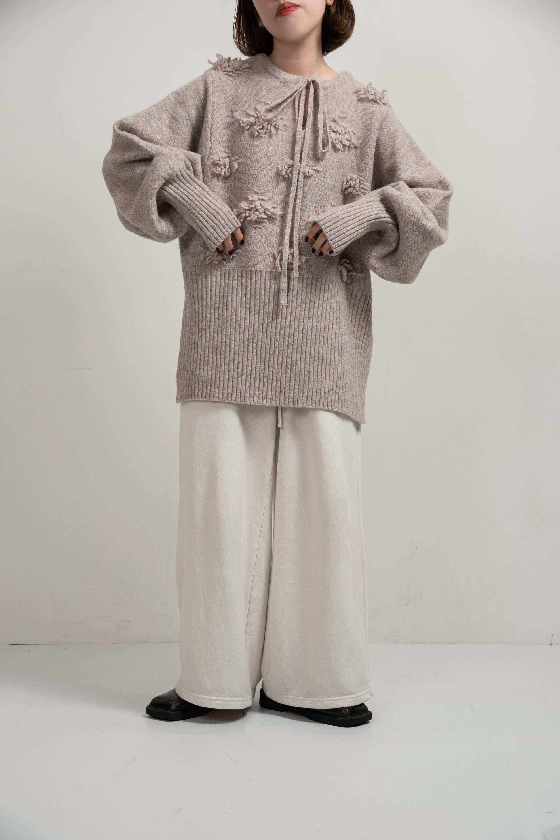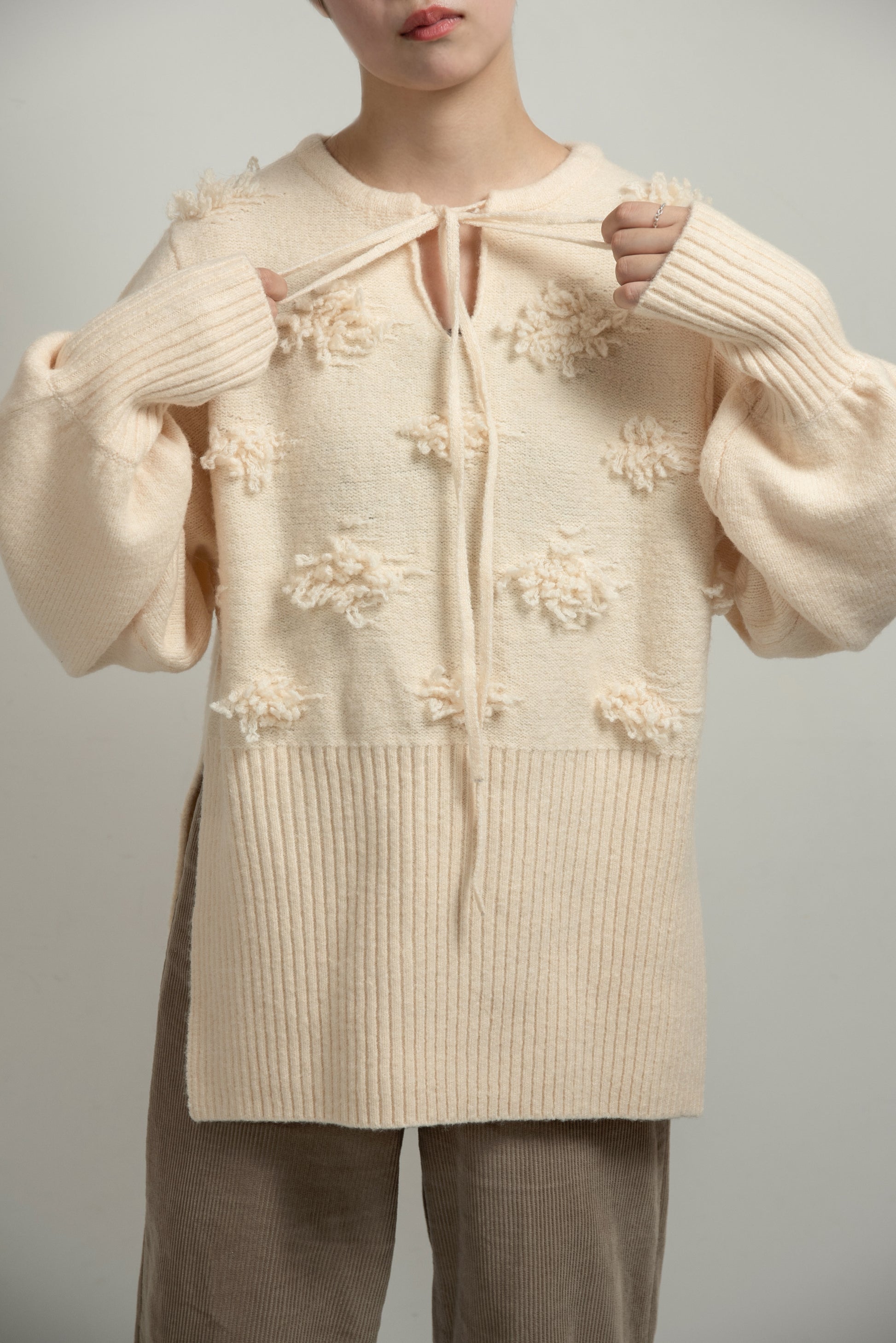 ・首元のリボンはラウンドネック部分の内側に通っており、首元を絞ることでお好みの開き具合に調整して着用できます