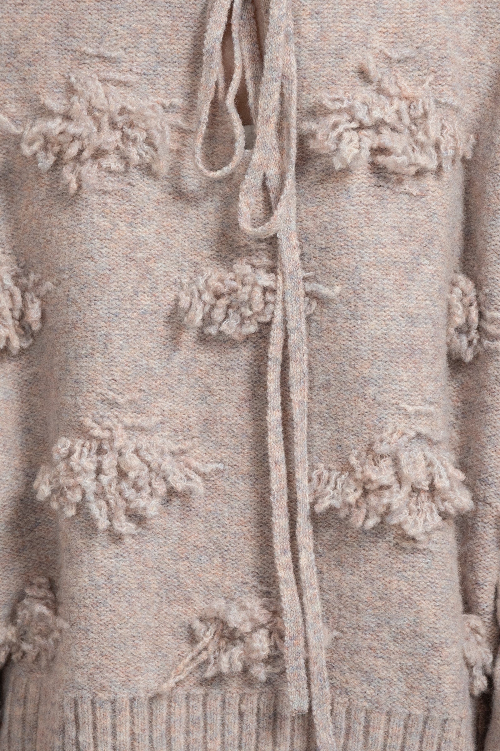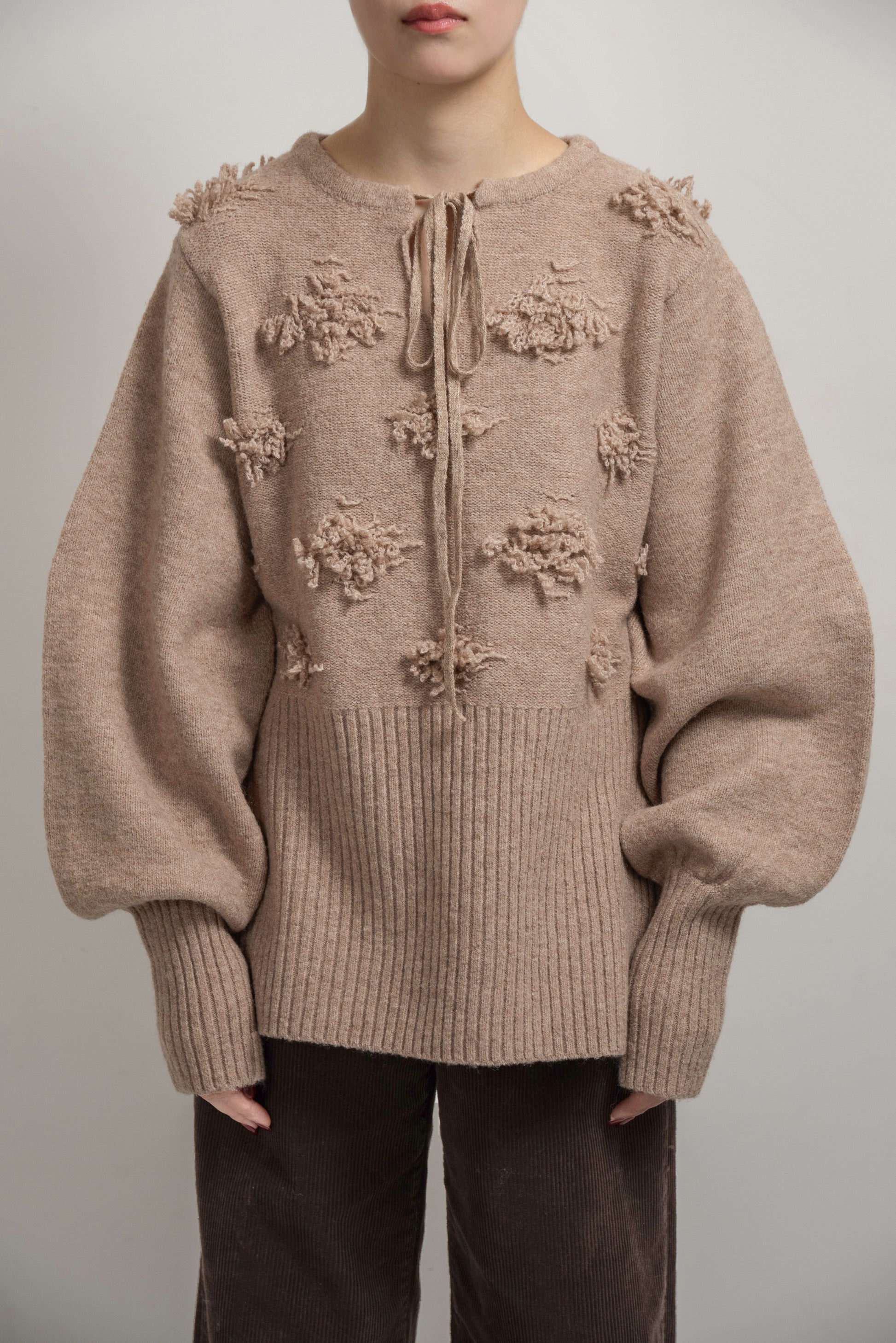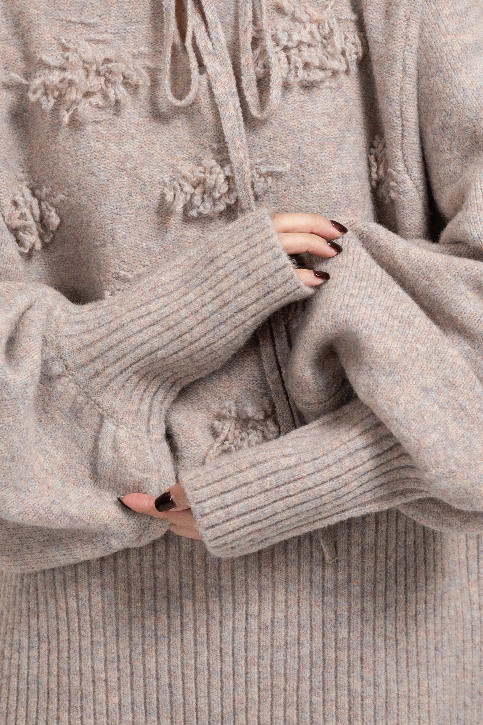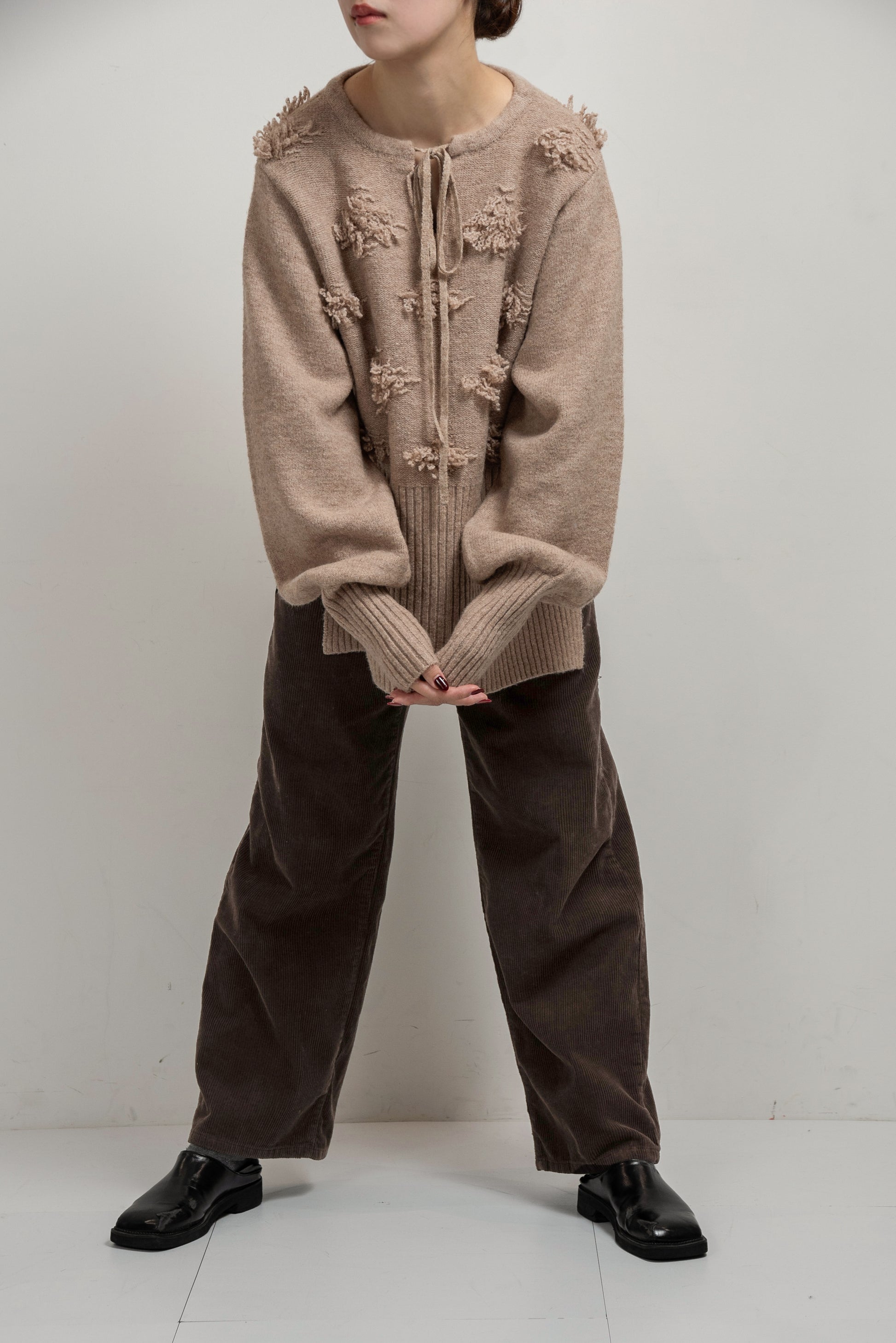 ・袖はあえて凹凸感のない編み柄にすることで、着膨れしにくく、細部までこだわったデザインに