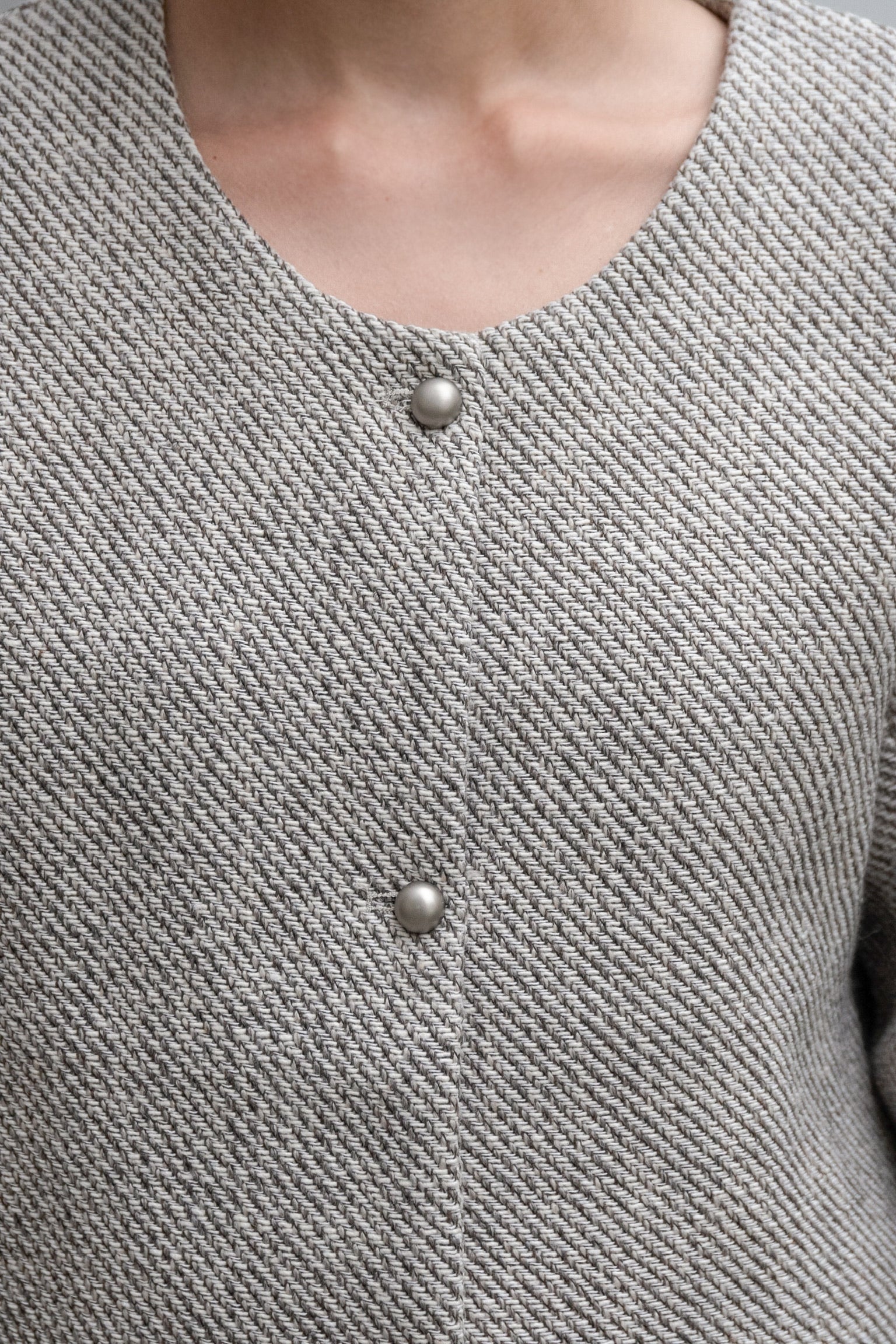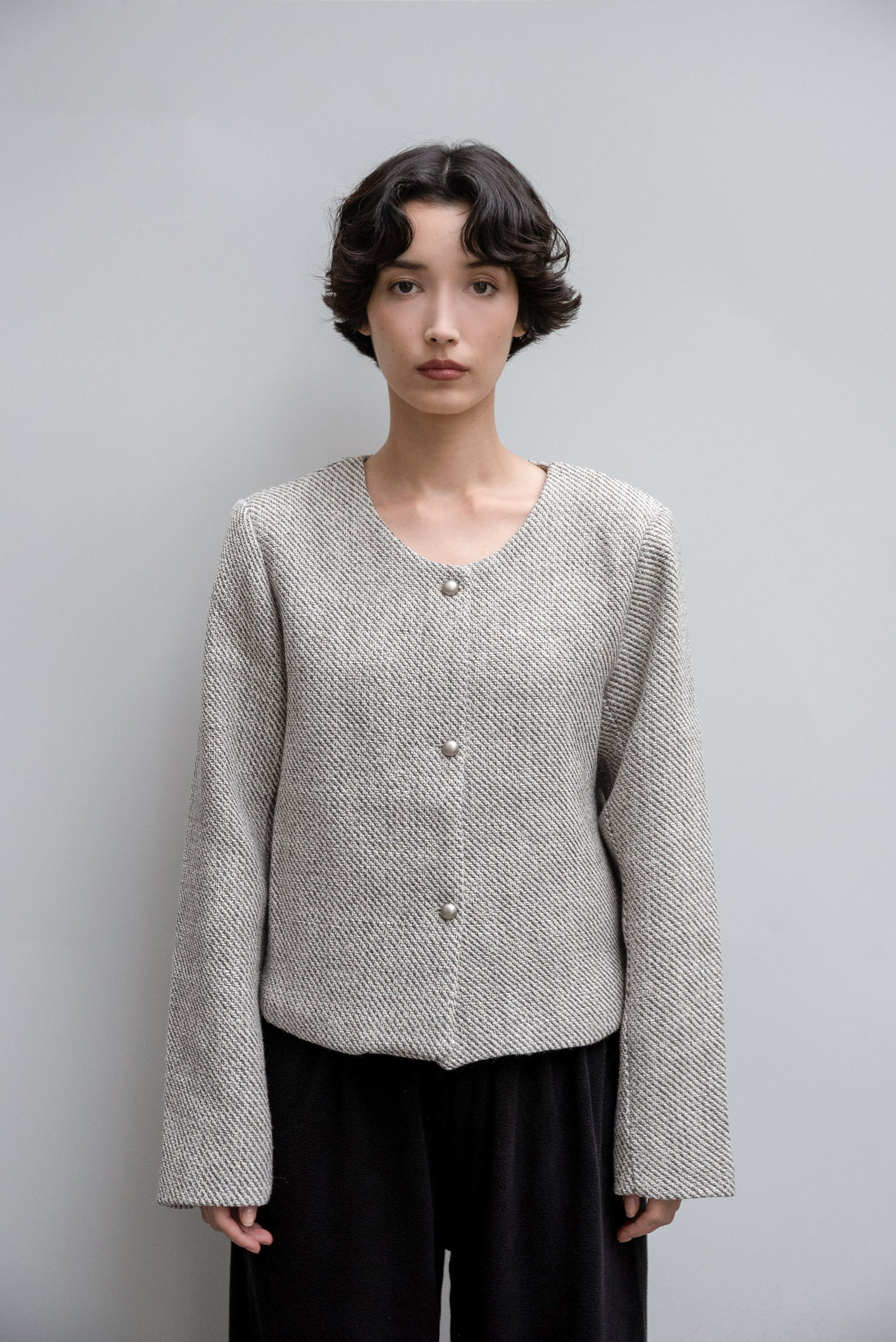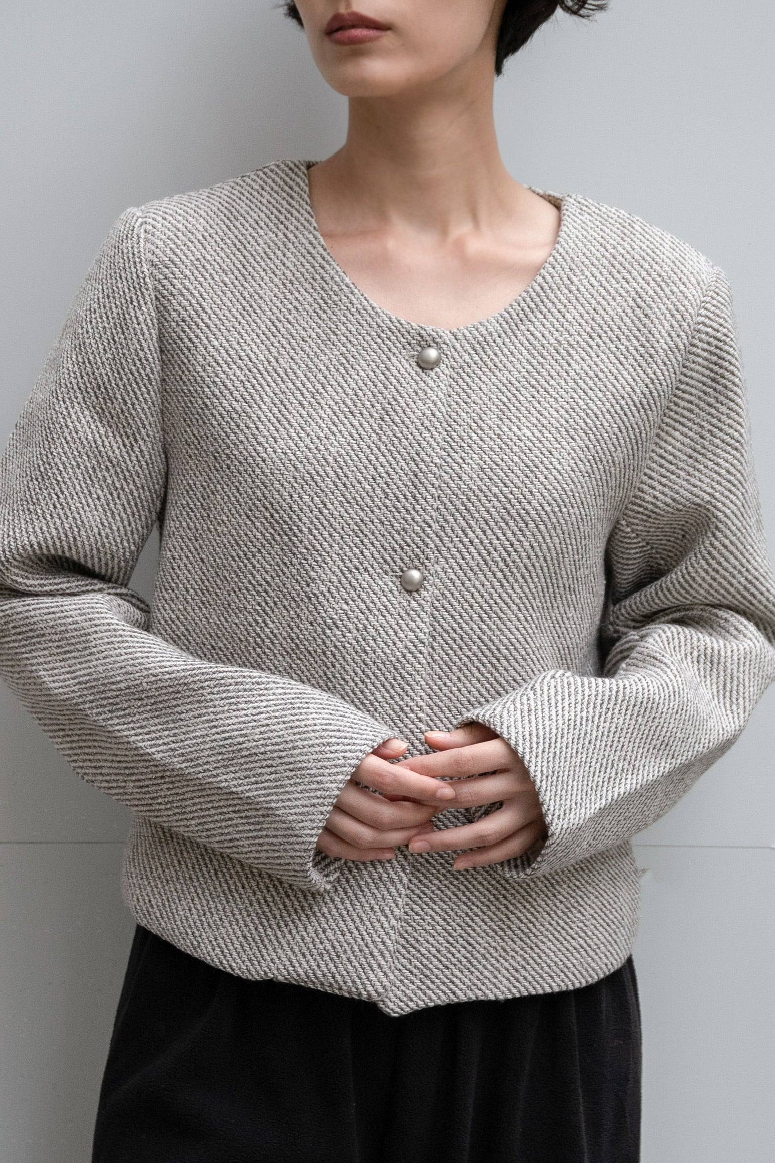 ・ミックス感のある生地と、印象的なボタンが目を引くノーカラーツイードジャケット